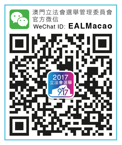 歡迎公眾透過智能手機等流動裝置,於微信內搜尋“澳門立法會選舉管理委員會”、“EALMacao”或掃描專屬二維碼,關注立法會選舉管理委員會發佈的最新選舉訊息。除微信訂閱帳號外,選管會同時已設有專屬網頁(www.eal.gov.mo),提供最新及詳盡的資訊,網頁內亦附上微信訂閱帳號的二維碼,方便公眾掃描及訂閱。