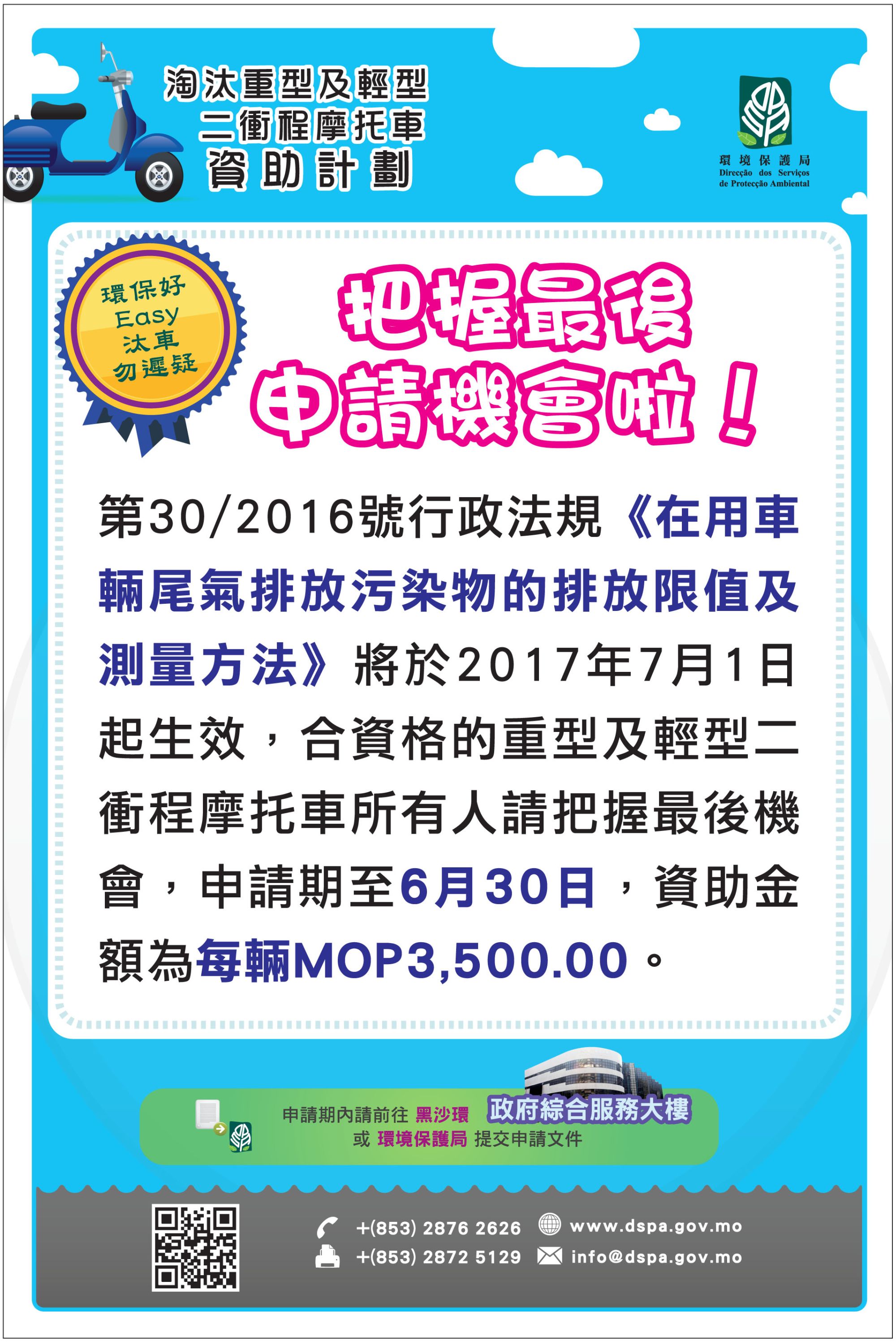 《淘汰重型及輕型二衝程摩托車資助計劃》將於本月30日結束,因應第30/2016號行政法規《在用車輛尾氣排放污染物的排放限值及測量方法》將於下月起生效,環境保護局再次呼籲未能達標的二衝程摩托車的車主和其他二衝程摩托車的車主把握最後機會參與資助計劃,以減少車輛尾氣排放,共同改善道路空氣質素。
