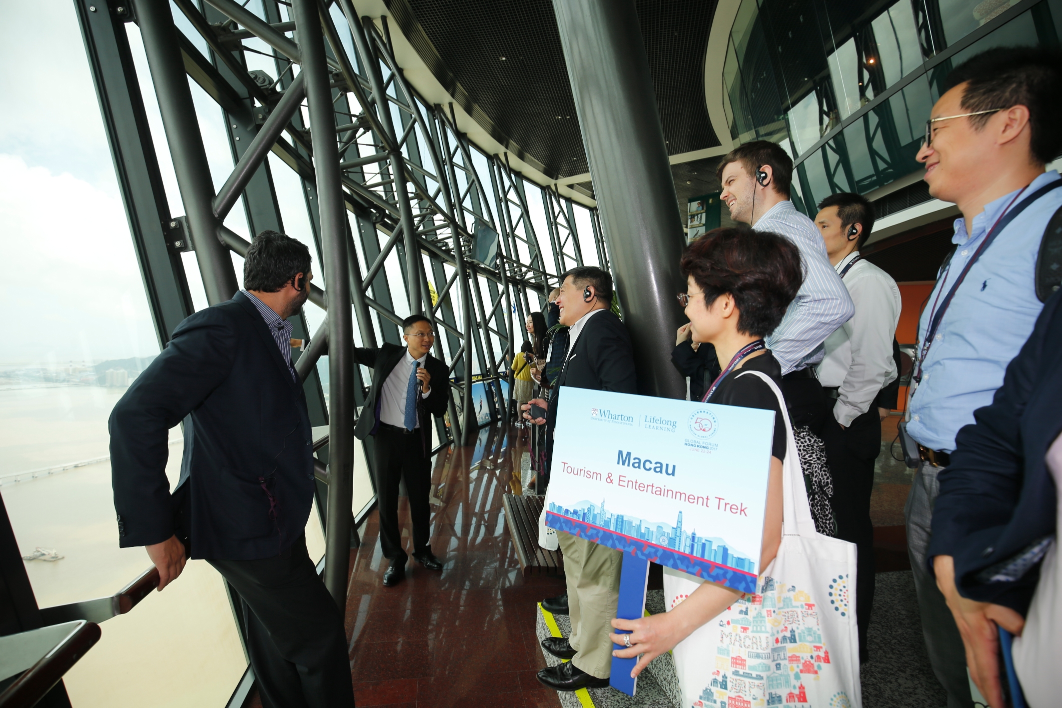 早上,考察團一行30人從香港赴澳,旅遊局為他們特設一個與旅遊及商務相關的介紹會,並邀請三個政府部門的領導擔任演講嘉賓,連同旅遊局局長文綺華講解澳門最新的基建項目、投資環境、旅遊及娛樂等發展情況。當中包括澳門博彩監察協調局局長陳達夫、澳門交通事務局局長林衍新及澳門貿易投資促進局代主席劉關華。會上,旅遊局局長文綺華歡迎考察團,而沃頓商學院代表亦為豐富的行程及交流活動等安排向旅遊局致謝。介紹會完畢後,考察團到旅遊塔58樓觀光廊俯瞰澳門及珠海的景色,並遙望港珠澳大橋大型基建項目及新城填海區等。