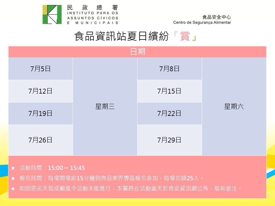 “食品資訊站夏日繽紛『賞』”活動由七月五日至二十九日逢周三及周六下午三時舉辦,活動時間約四十五分鐘,透過食安教育人員深入講解,教導食品安全在日常生活中的重要性。市民可於活動當天開場前十五分鐘到食品業界專區報名,每場名額二十五人,先到先得。導賞結束後,參加者可獲得精美紀念品或《牛奶的故事》填色繪本乙份,讓學習食安知識從社區延伸至家庭,亦藉親子共同完成填色繪本,從小培養食安意識。