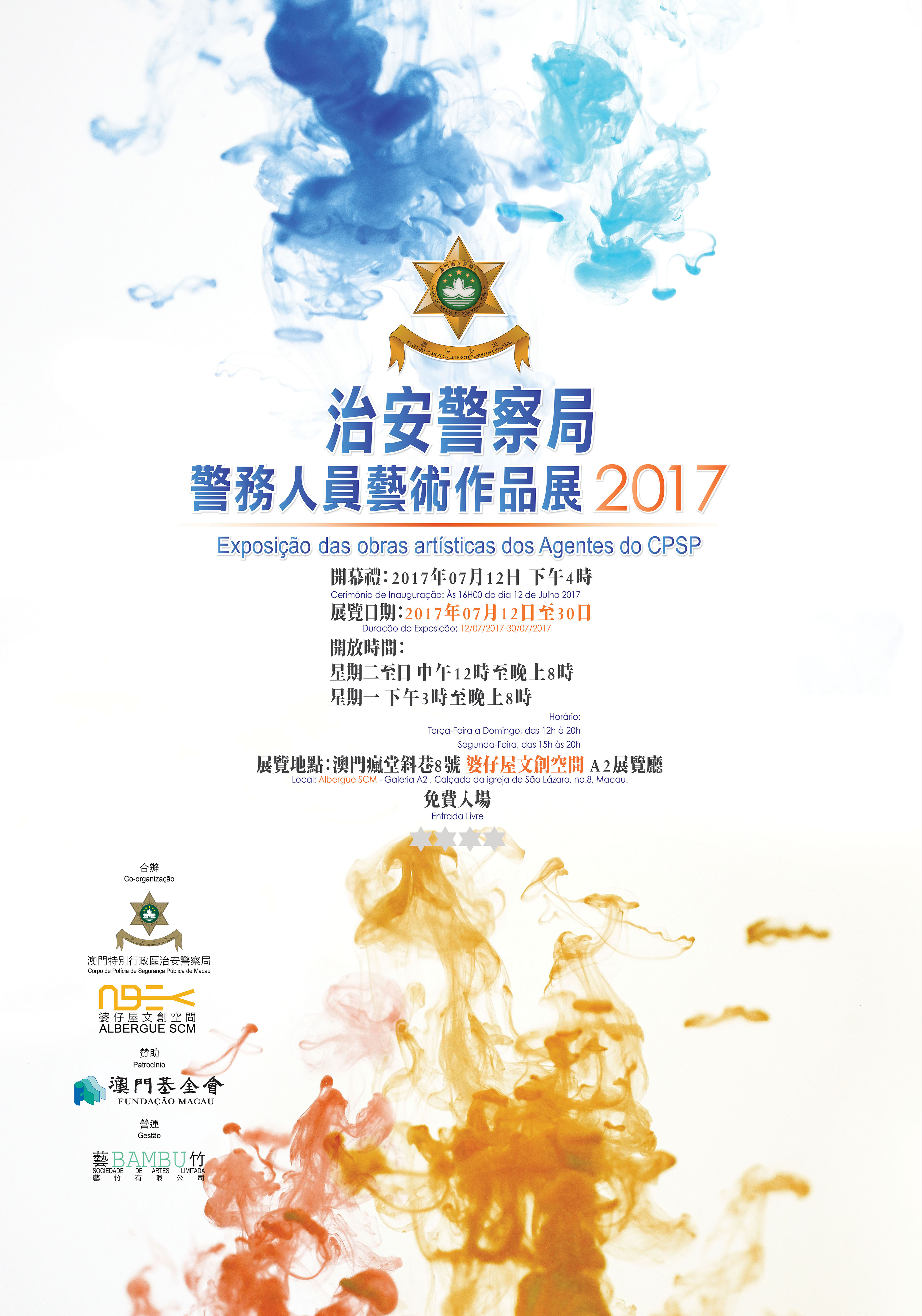 “2017警務人員藝術作品展”開幕儀式於2017年7月12日下午4時假婆仔屋文創空間隆重舉行。展覽日期由2017年7月12日至30日,開放時間分別為星期一下午3時至晚上8時;星期二至星期日中午12時至晚上8時,展覽地點於澳門瘋堂斜巷8號婆仔屋文創空間A2展覽廳,免費開放予公眾入場,歡迎蒞臨參觀指導。