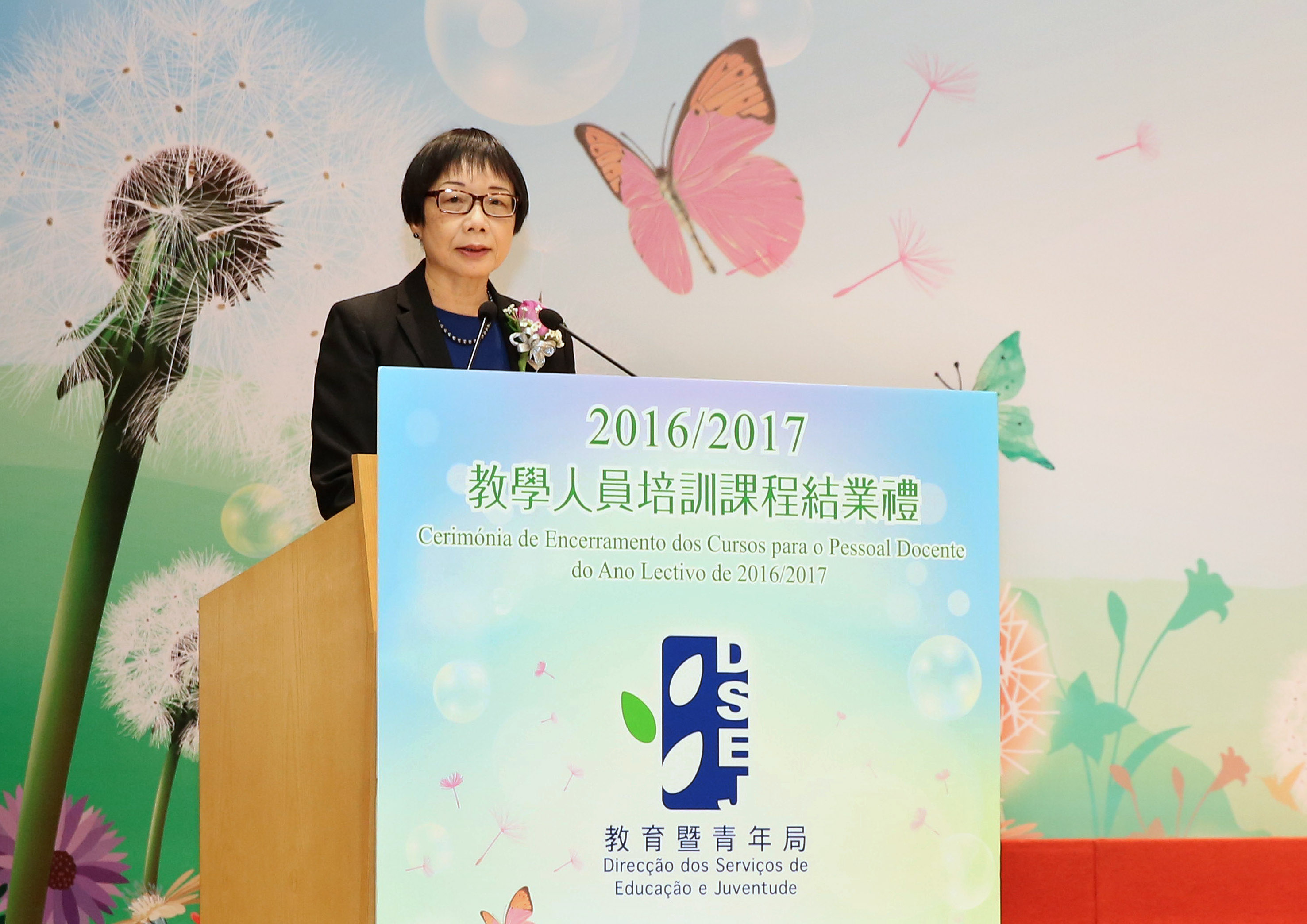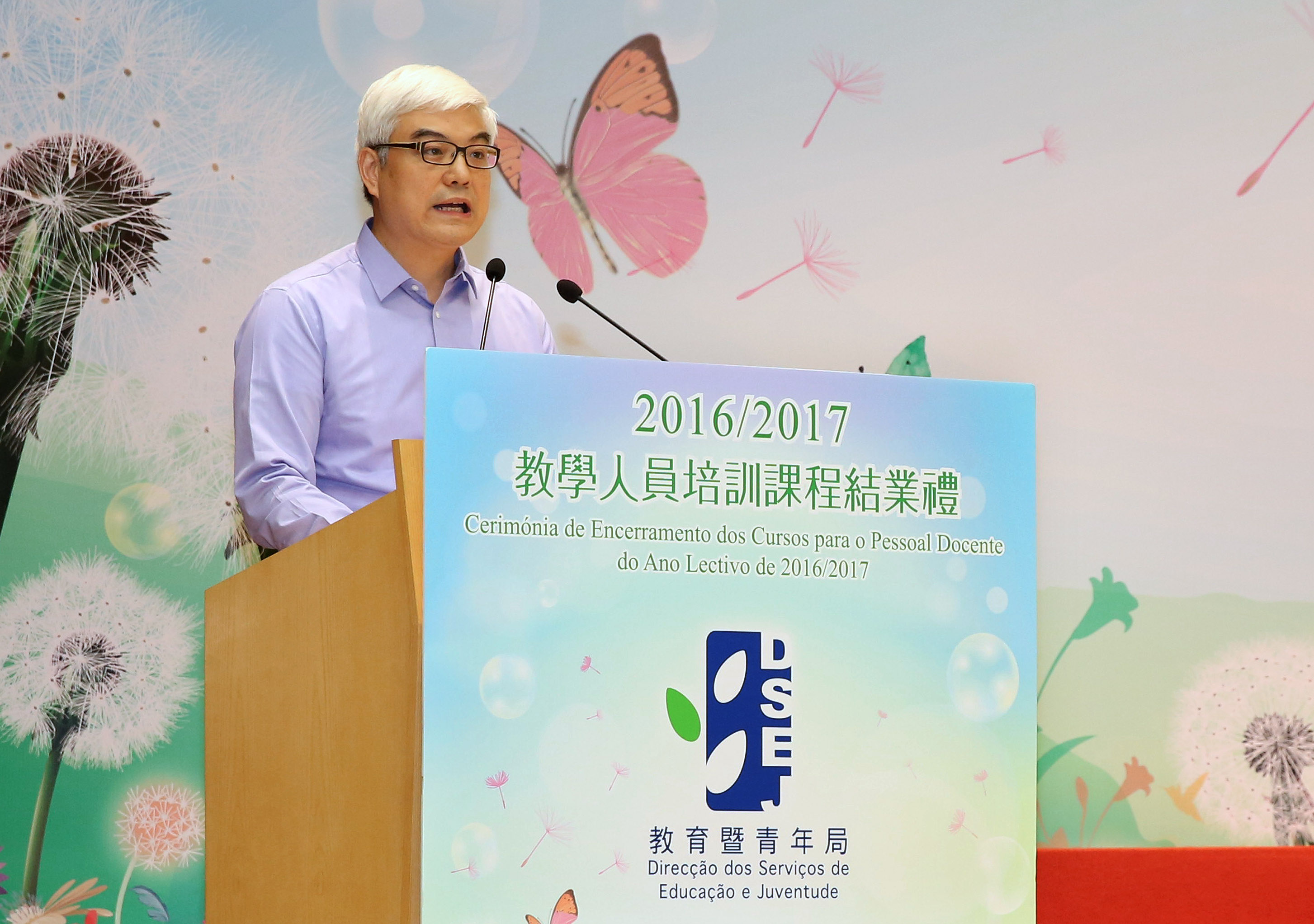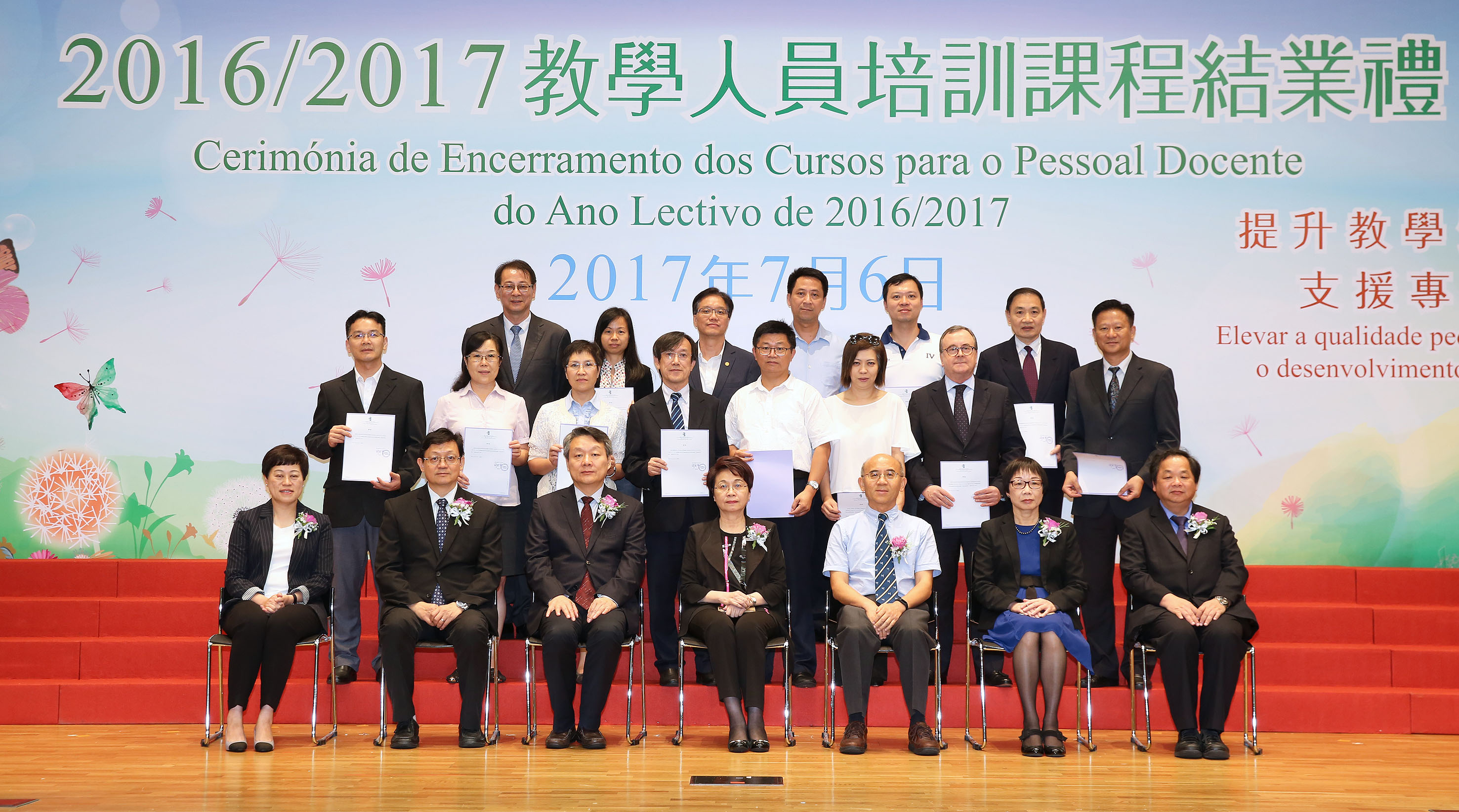 為了與教學人員共同分享完成培訓的碩果與喜悅,同時藉此鼓勵教學人員持續進修,為教育質素不斷的提升作出貢獻,教青局於7月6日下午假座鏡平學校(小學部)禮堂隆重舉行了“2016/2017學年教學人員培訓課程結業禮”。教青局局長梁勵、中央人民政府駐澳門特別行政區聯絡辦公室文化教育部副部長級助理邵彬、教青局副局長老柏生和郭小麗、澳門大學教育學院院長范息濤、澳門中華教育會理事長陳虹、澳門天主教學校聯會理事長黃彪,以及培訓機構的代表及導師、各校校長及參加培訓課程的300多名教學人員出席了典禮。