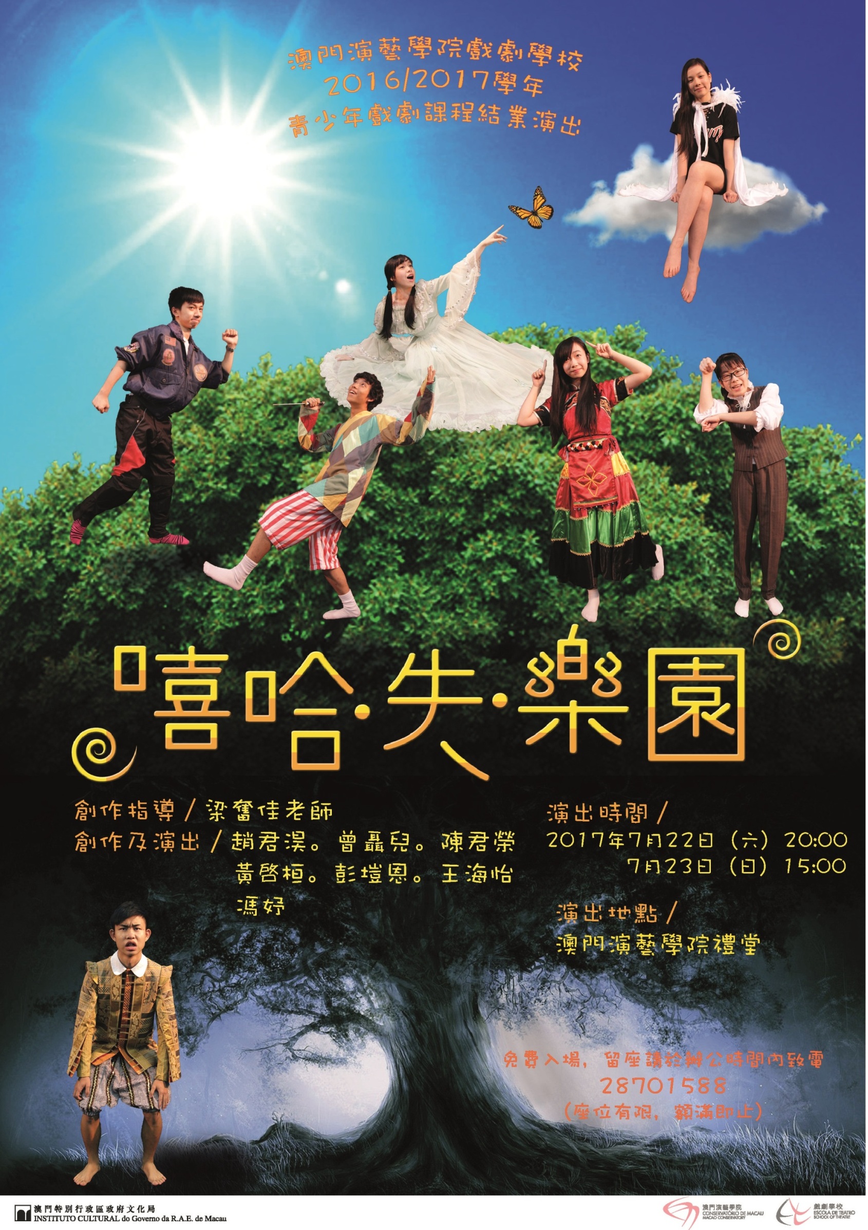 青少年戲劇課程結業演出《嘻哈•失•樂園》於七月二十二日(星期六)晚上八時及二十三日(星期日)下午三時在澳門演藝學院禮堂(澳門高士德大馬路14至16號)舉行,免費入場,座位有限,先到先得。留座請於辦公時間內致電二八七零一五八八。