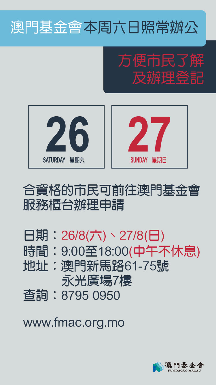 澳門基金會呼籲“家居修復援助金”及“醫療慰問金”的申請者仔細了解申請流程,並於澳基會網站先行登記,無須急於親身前往申請。為方便市民了解及辦理登記,澳基會將於本周六日 (8月26日及27日)照常辦公,中午不休息。澳基會再次提醒市民,醫療慰問金的申請截止日期為8月31日,家居修復援助金的申請截止日期為9月30日。查詢電話:8795 0950