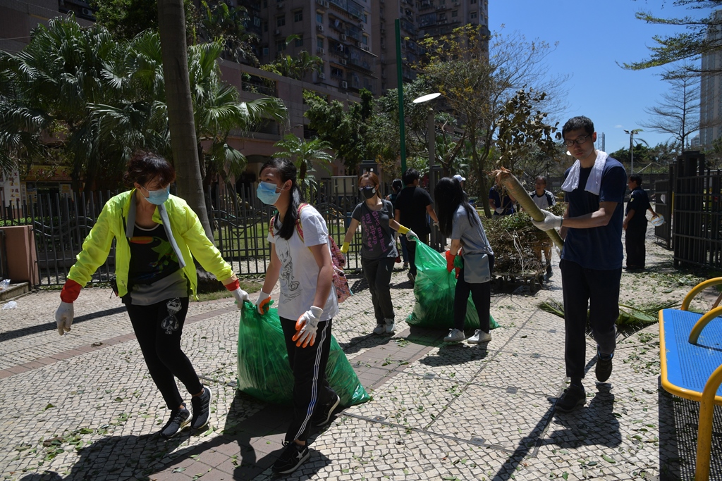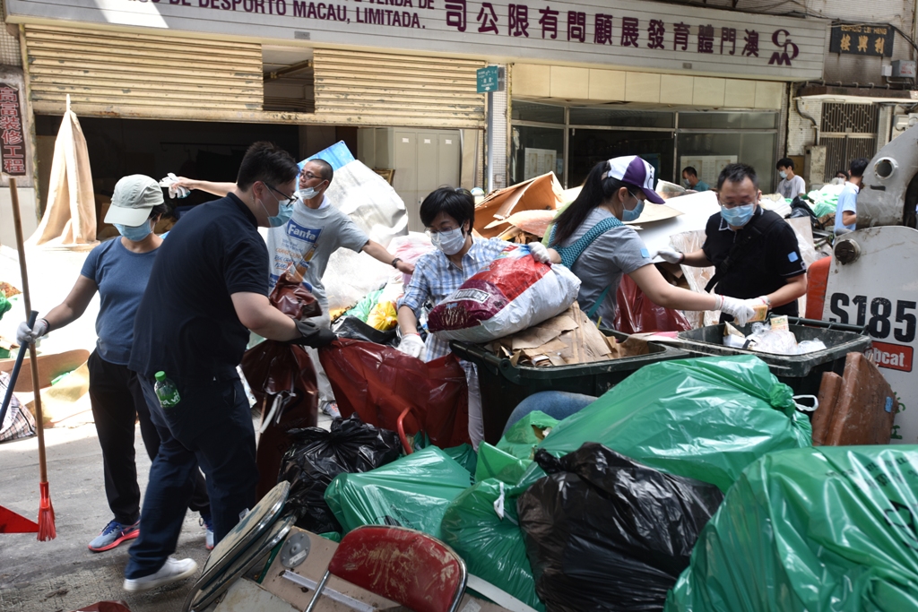 民政總署協調三十多個公共部門及機構組織公務員義工,分別到本澳各區清理垃圾,連日來有超過1,800名義工參與,行政法務司司長陳海帆及多個公共部門領導於今日(8月26日)繼續一同參與行動。陳海帆感謝每一位無私付出的工作人員及市民,表示政府會與市民一起共同努力,期望社會各界配合政府的善後工作,共渡時艱,盡快讓社區復原。