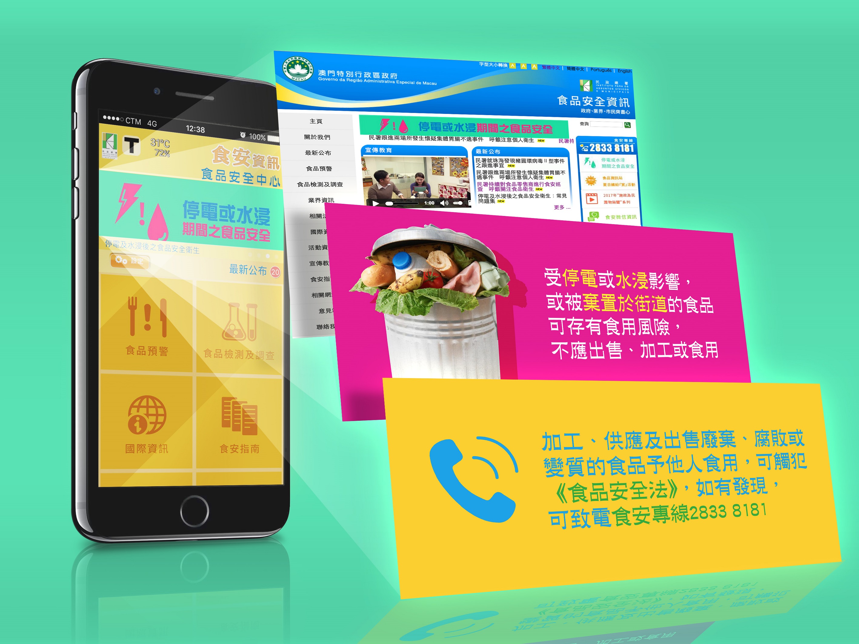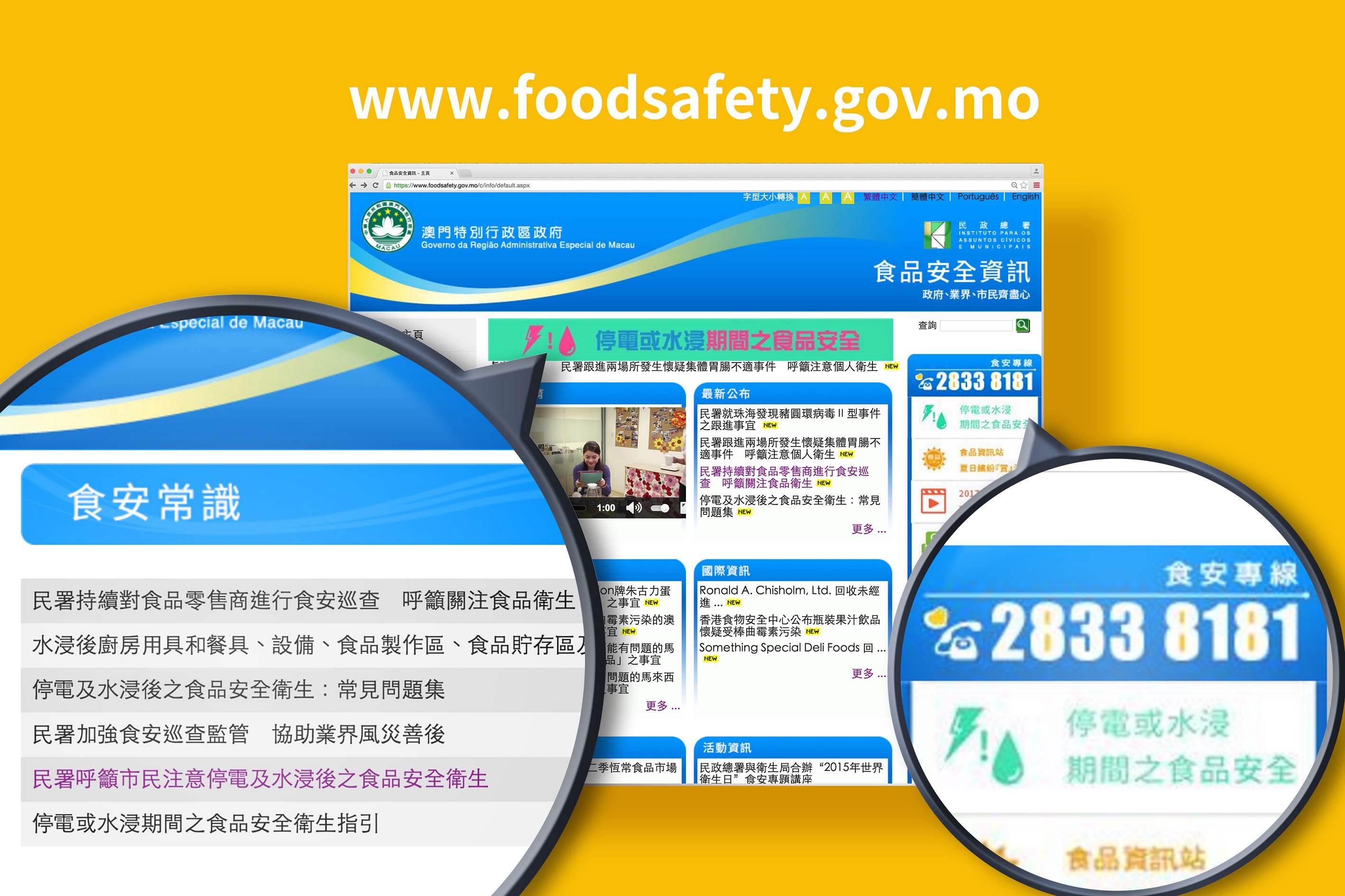 市民及業界可登入食品安全資訊網www.foodsafety.gov.mo或食安資訊流動應用程式App附設的“停電或水浸期間之食品安全”專頁,瀏覽各項風災後須注意之食安資訊,包括《水浸後廚房用具和餐具、設備、食品製作區、食品貯存區及用餐區的清潔消毒》及《停電及水浸後之食品安全衛生:常見問題集》等,透過簡明扼要的圖文內容,認識各項受水浸或停電影響之食品處理及設施設備維護方法,以便採取適當的善後措施。