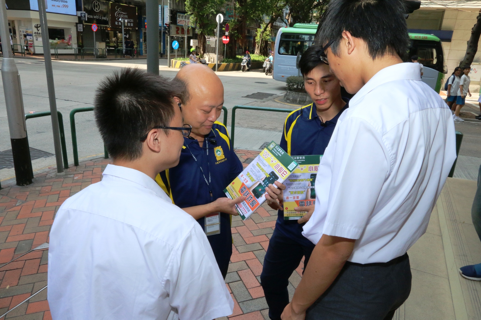 10月12日中午,司警局人員率先前往高士德區的咖啡店、茶餐廳、連鎖商店及快餐店等年輕人喜歡的聚腳點進行宣傳,於店內張貼提防電話詐騙宣傳海報,並向顧客派發防騙宣傳單張,提醒他們如接到來歷不明的電話,尤其是來電顯示為“00”或“+”號字頭的電話號碼,須保持警覺;若對方要求轉帳或匯款,這一定是騙局,切勿上當。