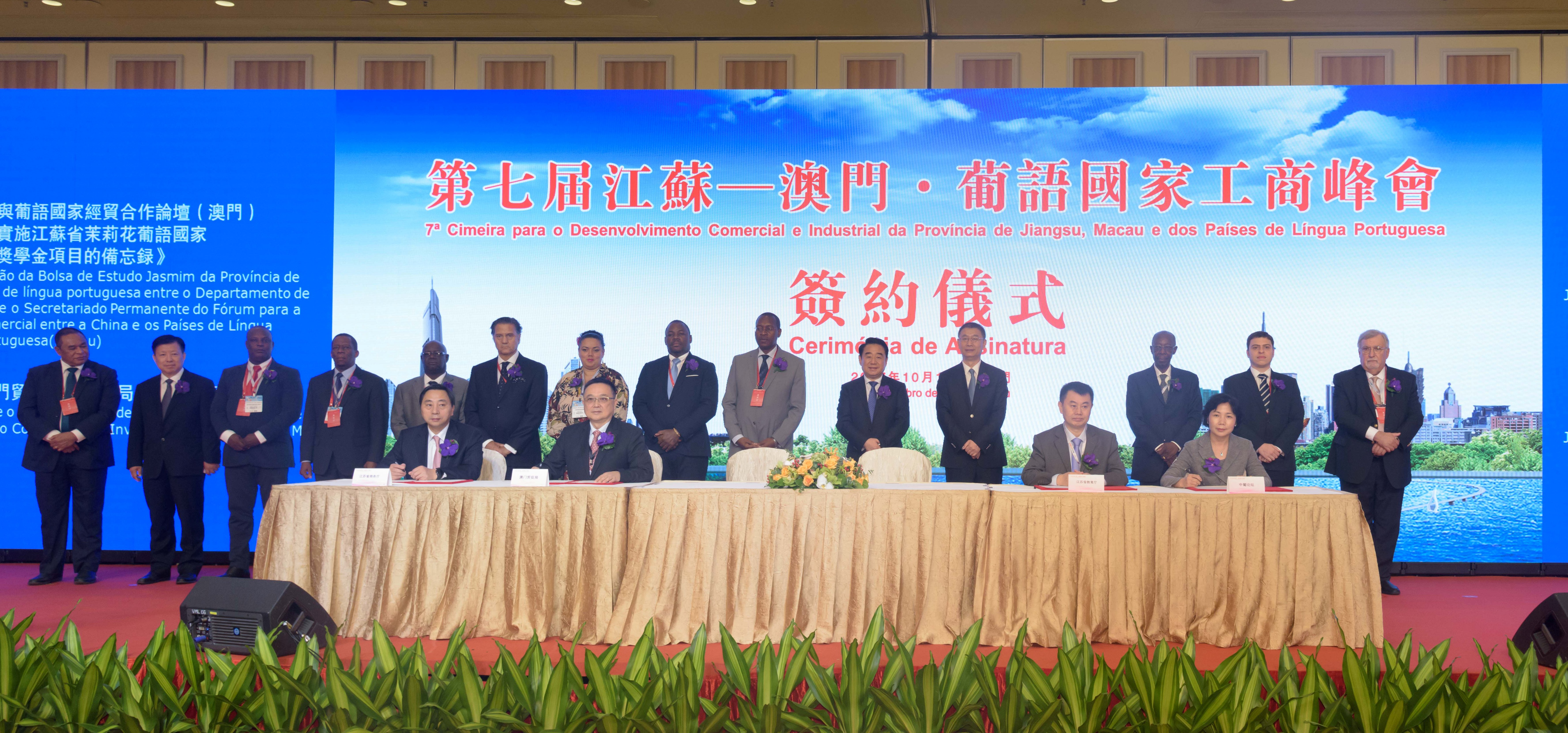 今年峰會成果豐碩,期間重點簽約項目包括:江蘇省教育廳與中葡論壇(澳門)常設秘書處簽署的《關於實施江蘇省茉莉花葡語國家留學生定向獎學金項目的備忘錄》,江蘇省商務廳與澳門貿易投資促進局簽署的《江蘇省商務廳與澳門貿易投資促進局合作備忘錄》,安哥拉OPAIA建設有限責任公司與中國江蘇國際經濟技術合作集團有限公司簽署投資總額達3.6億美元的戰略合作協定,TAMAR有限公司與江蘇省建築工程集團有限公司簽署的在安哥拉羅安達省總投資額達5000萬美元的T1、T2、T3建房項目,澳門晉商控股有限公司與江蘇省龍信建設集團有限公司簽署的在東帝汶總投資額達8000萬美元的葡萄牙自由中心城項目等。峰會的平台作用逐步得到發揮,推進了江蘇與澳門及葡語國家在投資及貿易、教育、農業、旅遊、漁業、基礎設施等領域的務實合作。