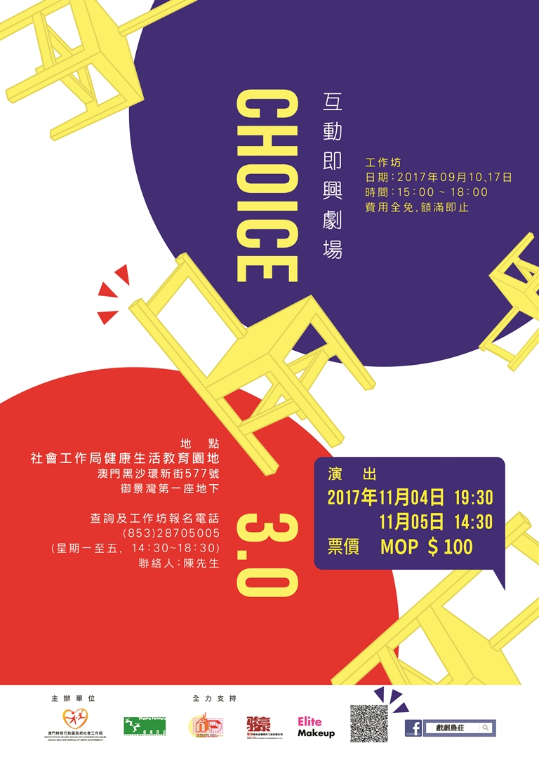 社工局與戲劇農莊早於9月至10月份合辦“即興表演工作坊”,培訓了20多位青少年,並遴選出13人參與11月份的互動即興劇場“Choice 3.0”。是次演出以演員個人故事為主調,與觀眾有互動情節,透過交流共同解決故事矛盾,引導正向人生,活動旨在加強觀眾對不良引誘的抗逆力。演出日期為11月4日晚上7時半及11月5日下午2時半,地點為社工局轄下的健康生活教育園地(黑沙環新街577號御景灣地下)。