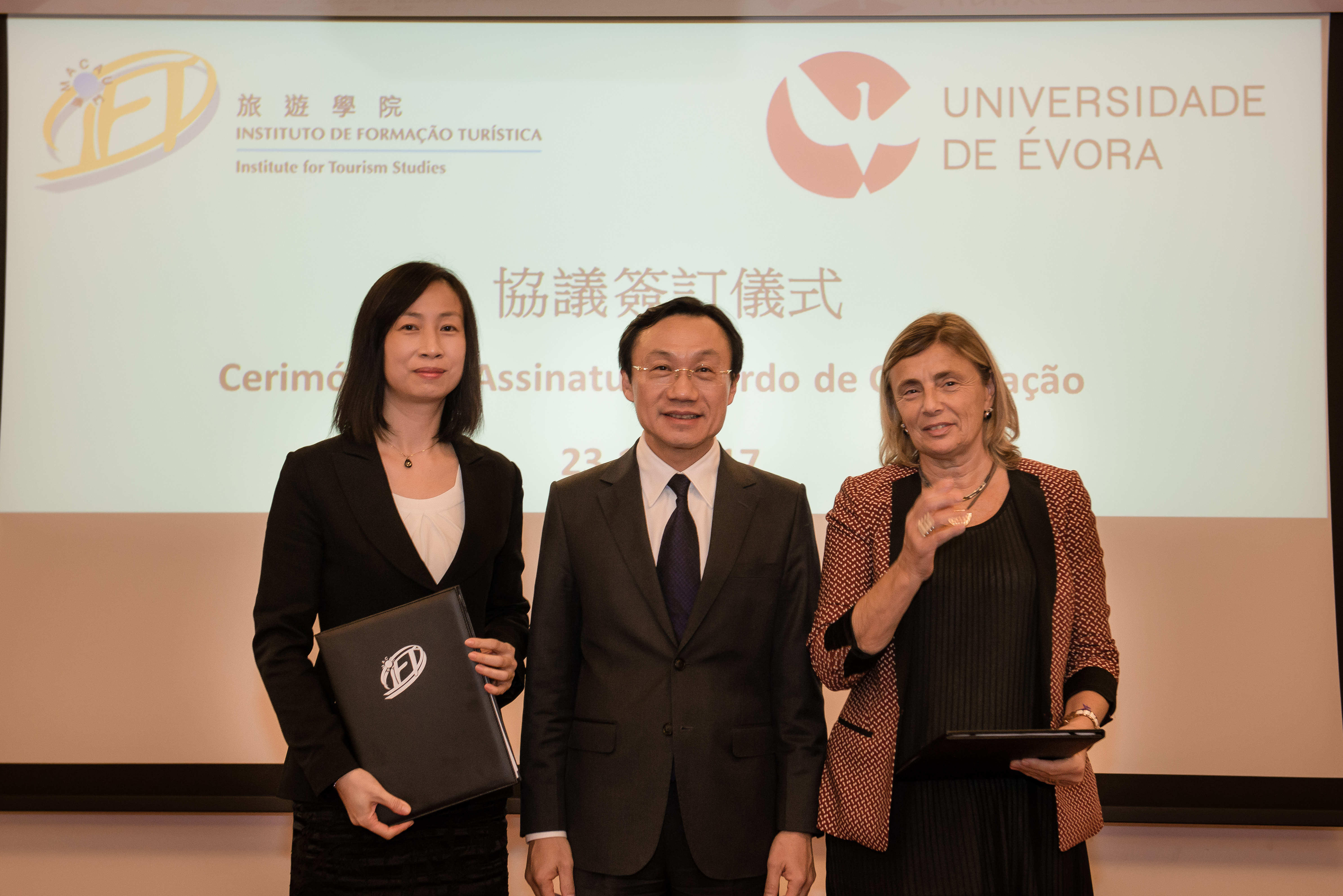 10月23日,在澳門特別行政區政府社會文化司司長譚俊榮博士的見證下,旅遊學院與葡萄牙埃武拉大學舉行合作協議簽訂儀式。儀式上,由旅遊學院院長黃竹君博士及葡萄牙埃武拉大學校長Ana Costa Freitas教授簽署合作協議。