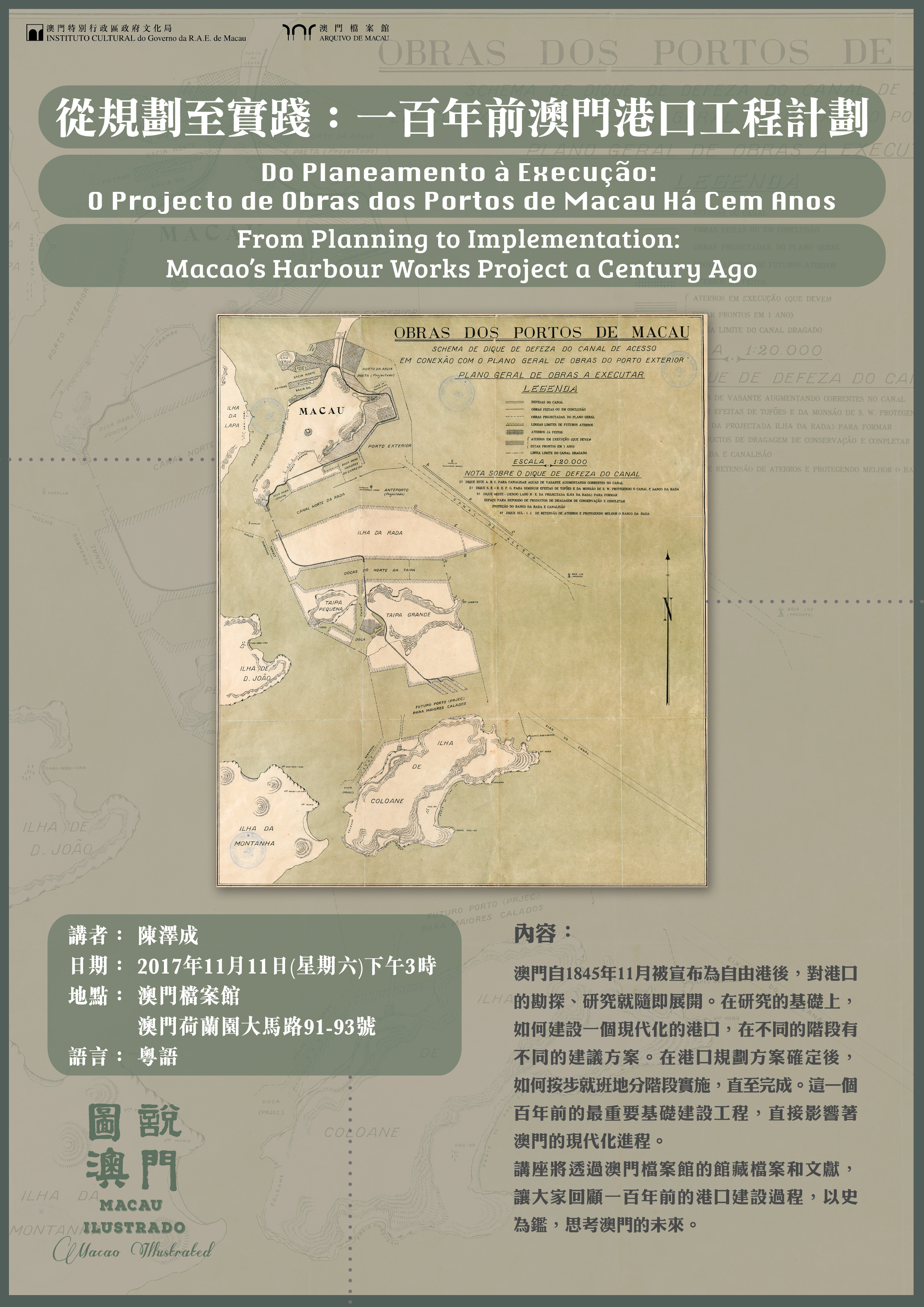 澳門自一九八四年十一月被宣布為自由港後,對港口的勘探、研究就隨即展開。在研究的基礎上,如何建設一個現代化的港口,在不同的階段有不同的建議方案。在港口規劃方案確定後,如何按步就班地分階段實施,直至完成。這是—個百年前的重要基礎建設工程,直接影響著澳門的現代化進程。是次講座由陳澤成擔任主講嘉賓,將透過澳門檔案館的館藏檔案和文獻,回顧一百年前的港口建設過程,以史為鑑,思考澳門的未來。