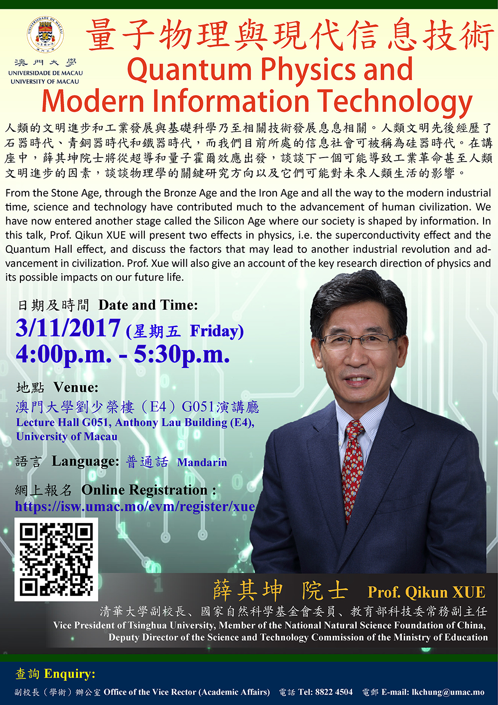 澳門大學將於11月3日舉行“量子物理與現代信息技術”講座,邀請清華大學分管科研的副校長、國家自然科學基金會委員、教育部科技委常務副主任薛其坤擔任主講,探討物理學的最新研究及其與信息技術、社會發展的關係。歡迎有興趣人士參加。