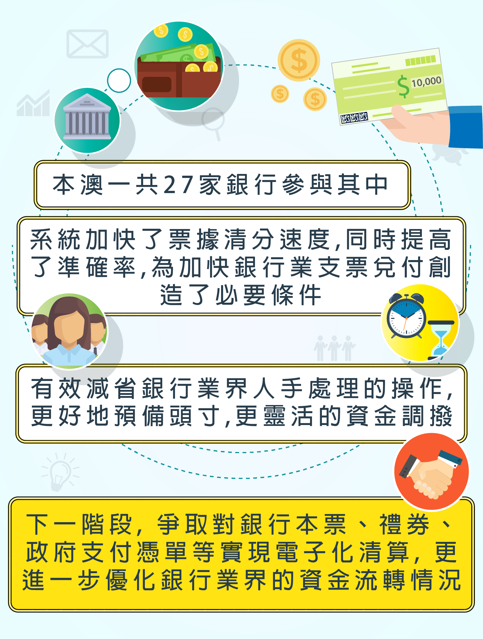 為配合澳門經濟的快速增長,促進本地金融業的發展,金管局與業界合作,作持續優化本澳的金融基礎設施。新建的票據清算電子化系統,為加快銀行票據兌付創設了必要條件,縮短客戶資金到帳時間,便利市民進行資金管理,以及從提升資金調撥效率方面改善營商環境。