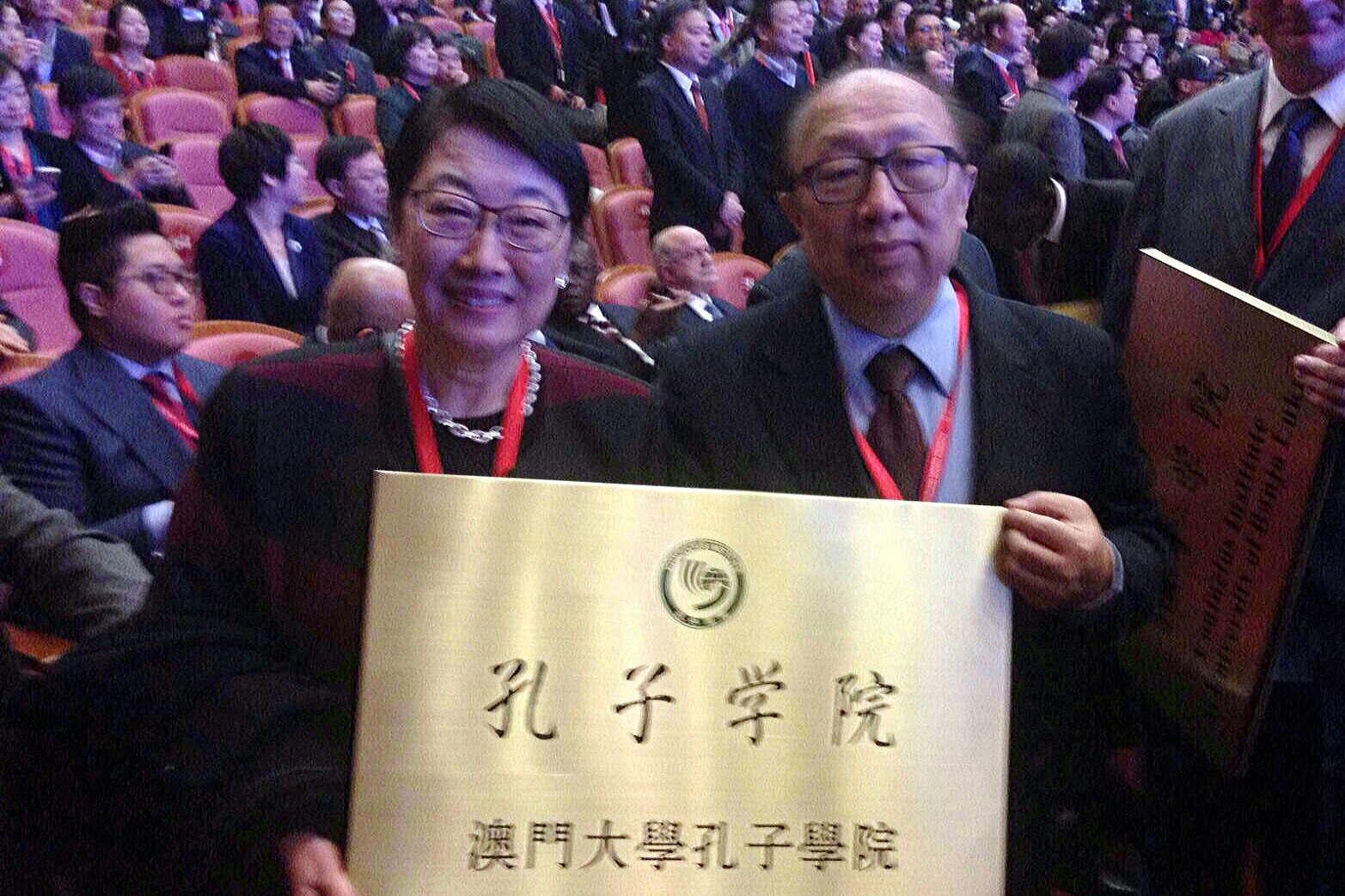 澳大校長趙偉及人文學院院長靳洪剛日前出席於西安舉行的第十二屆孔子學院大會,在開幕禮上從國務院副總理、孔子學院總部理事會主席劉延東手上領授“澳門大學孔子學院”牌匾。