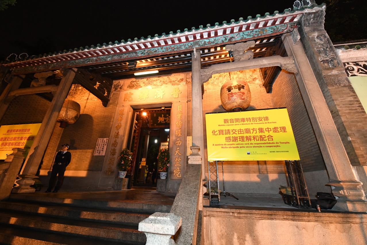 同時,由於觀音堂的香火特別鼎盛,為加强管理,觀音堂除了在前院設置衣寶收集處外,亦將於大雄寶殿前空地放置香爐,同時暫停使用其餘香爐和化寶爐,避免善信攜帶香燭和祭品進入室內範圍,確保安全,敬請市民留意。此外,觀音堂門前的空地將實施人流管制,文化局亦將於觀音開庫期間加派人手巡查各廟宇,宣傳和鞏固大眾的廟宇防火意識。