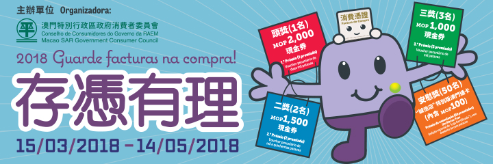 “存憑有理 – 2018”活動現已開始,凡於該活動結束前年滿十五歲的本澳居民,自3月15日起至5月14日期間在“誠信店”單筆消費金額滿50元或以上,就可憑相關的消費憑證參加抽獎,獎品包括頭獎2,000元(一名)、二獎1,500元(兩名)、三獎1,000元(三名)的現金券,五十名安慰獎各得內附100元的“誠信店”特別版電子貨幣儲值咭乙張。