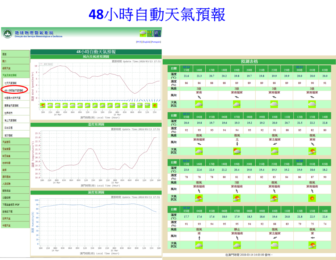 有關優化天氣預報服務方面,氣象局除現時提供的未來7日天氣預報外,針對短時效的天氣變化,為更貼合市民出行需要,氣象局亦通過網站提供溫度和濕度在未來48小時的自動逐小時預報。為進一步提升相關服務,氣象局將於「世界氣象日」(23日)優化及豐富網站內容,包括在未來48小時自動天氣預報上,新增預報天色和風兩個氣象元素和各元素的時間序列圖。在實時天氣資料顯示方面,新增日最高溫度和日最低溫度、各監測元素的時間序列圖;天氣預報圖新增等壓線資訊等。此外,亦對空氣質量「時指數」的計算和顯示進行優化,讓市民更易掌握本澳空氣質量狀況。