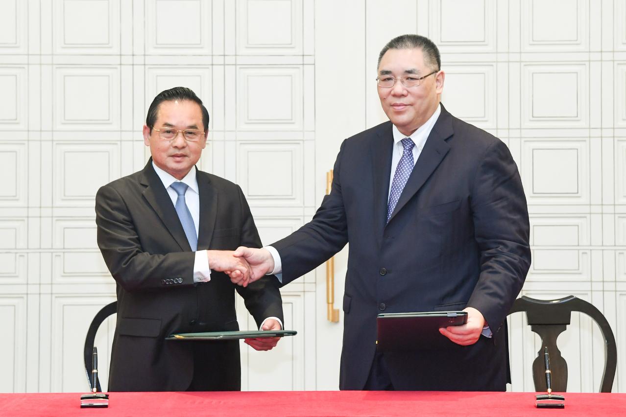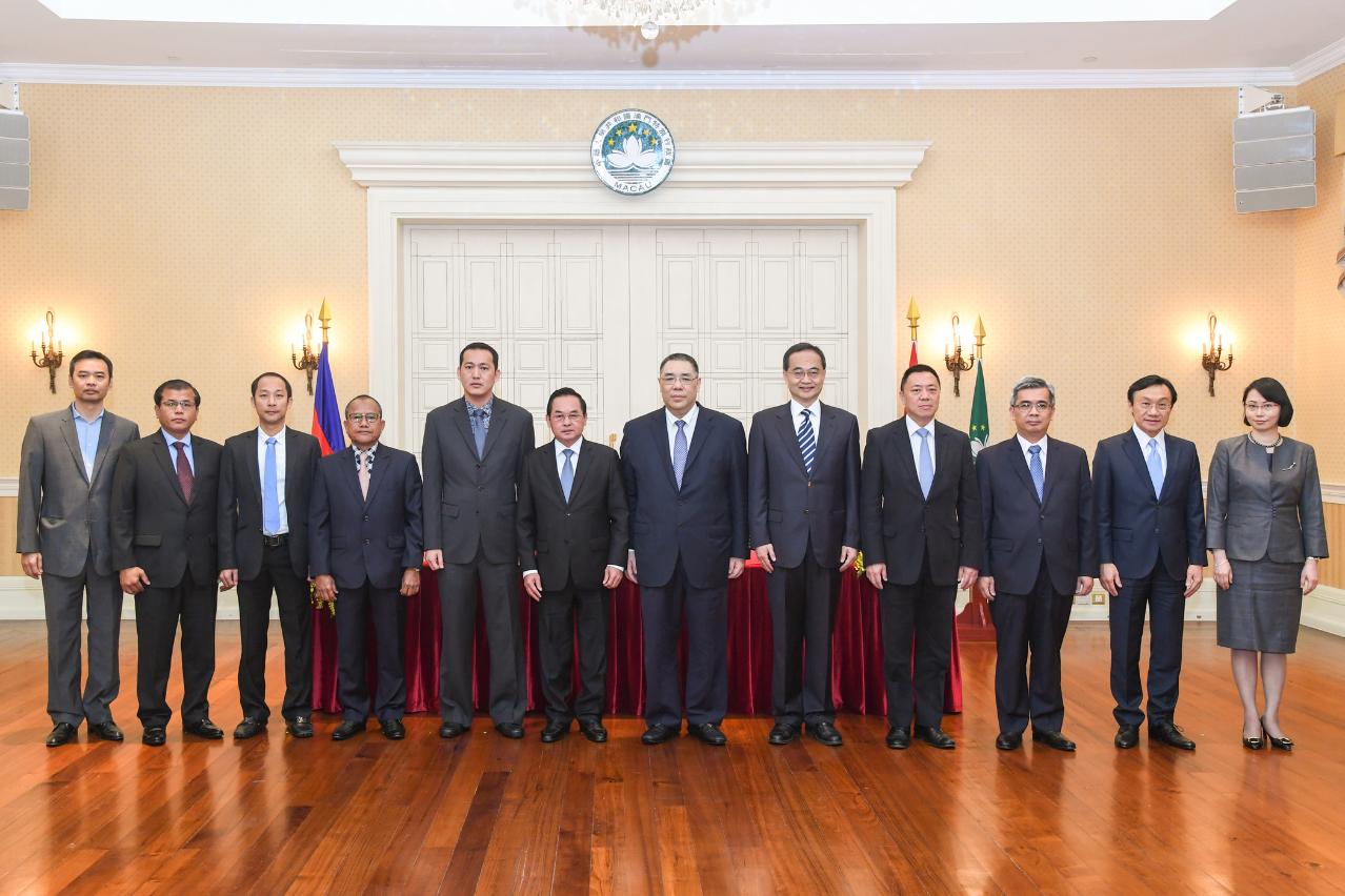 《柬埔寨王國暹粒省與中華人民共和國澳門特別行政區締結友好關係諒解備忘錄》簽署儀式上午在政府總部舉行,由行政長官崔世安和暹粒省省長肯文松(Khim Bunsong)代表兩地政府簽署。