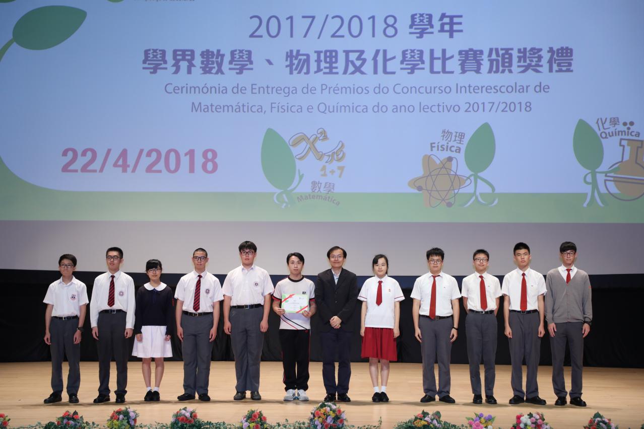 由教育暨青年局及澳門大學合辦的 “2017年澳門高中學生化學競賽” 、 “2018年澳門中學物理競賽” 及 “2018年校際數學比賽” 已順利完成。為表揚獲獎學生在該三項學科比賽中的努力,主辦單位於2018年4月22日下午假澳門大學會堂舉行了2017/2018學年學界數學、物理及化學比賽頒獎禮,分別有217名學生和39名老師獲獎。