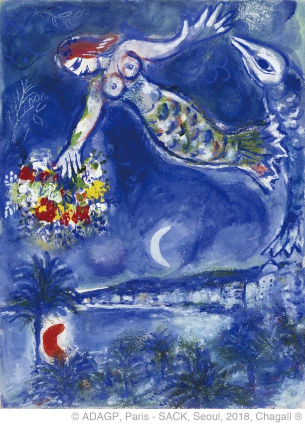 馬克‧夏加爾(1887-1985),生於白俄羅斯,是現代派繪畫的代表人物,上世紀五十年代移居法國南部,為上世紀最具代表性的藝術巨擘之一,其作品早期曾受立體派及野獸派的影響,以及曾經受到不同文化的薰陶,經歷了戰爭與逃亡的洗禮,其豐富的色彩使作品有著極強烈的個人風格。他的藝術與其時代一致,體現了一種普世價值──和平。他從二十世紀各種藝術運動中汲取靈感,卻又不參與任何一個運動,作品具有鮮明的個人特徵,繽紛的色彩及溫暖的光線讓觀眾仿如遊歷於遙遠的夢幻國度。