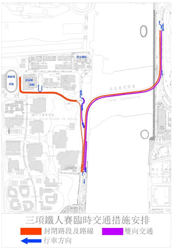 因舉行三項鐵人賽,6月17日(周日)上午路氹多處道路實施臨時交通措施,上午7時30分至11時3條巴士路線改道行駛,交通事務局呼籲公眾留意。(詳見附表)