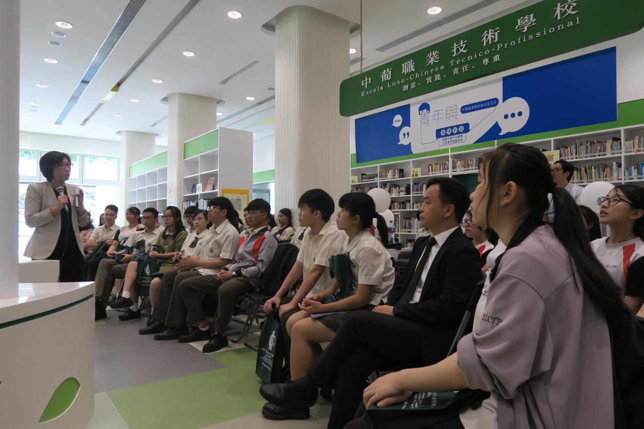 6月15日,中葡論壇常設秘書處輔助辦公室假中葡職業技術學校圖書館舉辦“青年與中葡論壇輔助辦公室主任真情對話"活動。中葡職業技術學校陳英倫校長出席並與輔助辦莫苑梨主任和數十位修讀中葡翻譯的中學生圍繞“認識中葡平台優勢,立足澳門放眼世界”主題展開真情對話,交流過程輕鬆活躍。莫苑梨冀通過與青年零距離交流,讓他們進一步認識澳門作為中葡平台各項功能優勢,加深了解中葡論壇,同時勉勵學生裝備自身的專業知識,積極參與中葡平台建設的工作,立足澳門背靠祖國放眼世界。