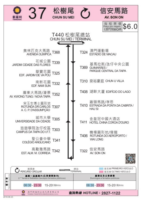 有關37及72巴士路線調整行程及停靠站點詳見附表;另外,37路線提前於上午6時30分提供服務,由原定30至35分鐘一班加密至15至20分鐘一班,以優化服務、便民出行。