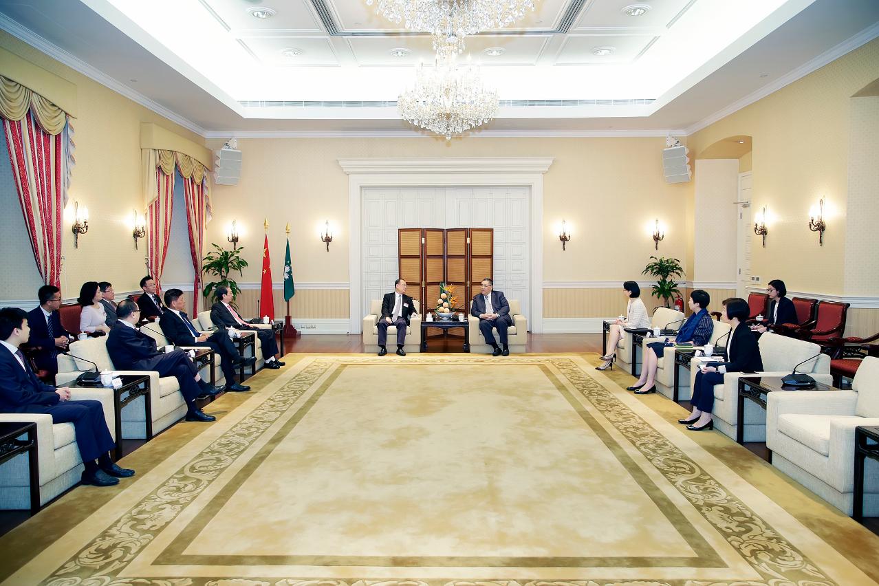 行政長官崔世安今(2)日在政府總部會見粵港澳大灣區企業家聯盟創會主席蔡冠深一行,就粵港澳大灣區發展前景交換意見。