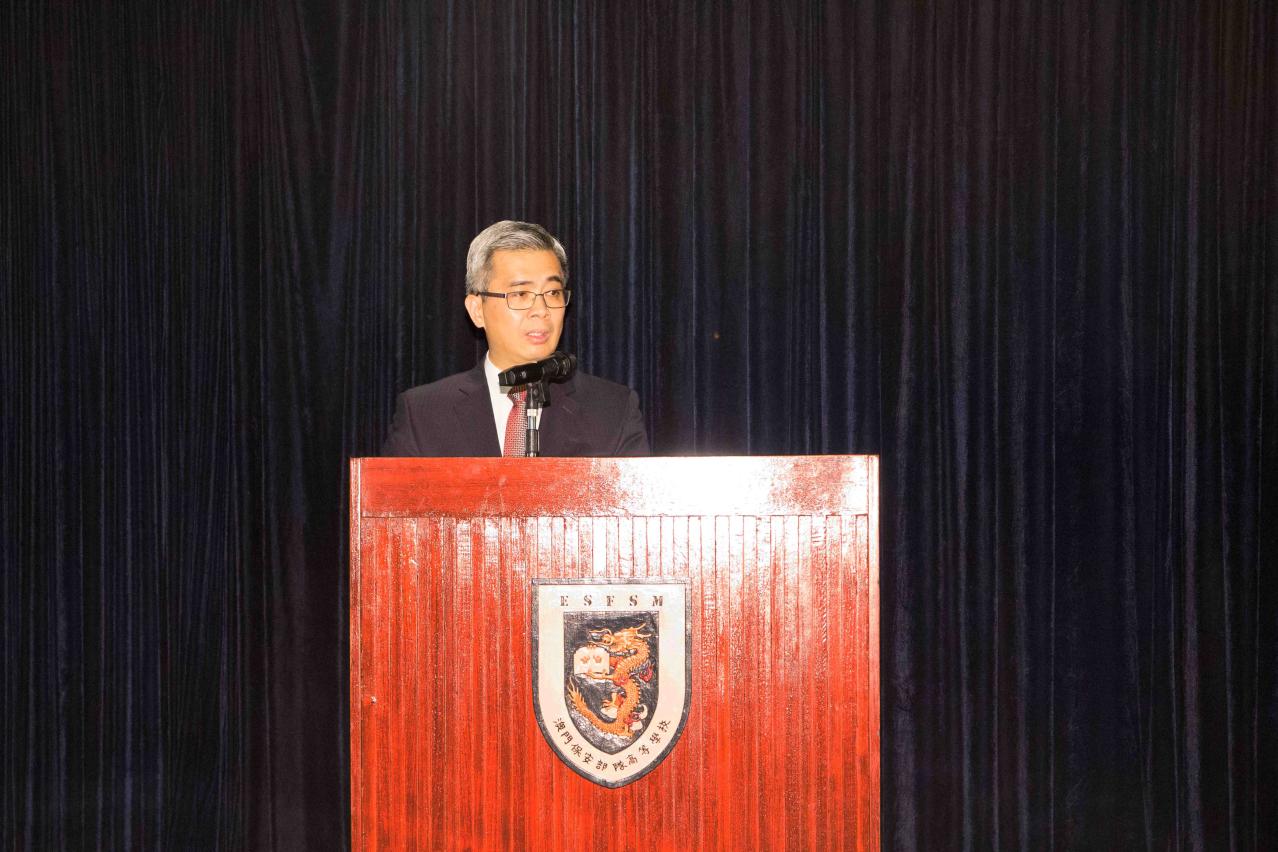 保安高校許少勇校長致辭時表示:創立於1988年的保安高校,肩負着一個非常重要的使命,為保安部隊培訓優秀和專業人才,提升保安部隊人員素質,維持一支廉潔、高效的保安部隊,為市民提供優質服務。同時表示自澳門特區第四屆政府上任以來,根據行政長官“以民為本、科學施政”的方針,保安當局提出了“主動警務”、“社區警務”和“公關警務”三大警務理念,持續加強警民合作,強化執法的綜合能力,切實維護社會安全和社會秩序,確保澳門的長治久安。展望未來,隨着《高教法》於2017年7月通過,並於今年8月起生效,保安高校正積極進行相關的配合工作,調整學校組織架構、課程設置等。當修法工作完成後,將設立警務碩士課程,期望進一步加強澳門警學理論的研究工作。