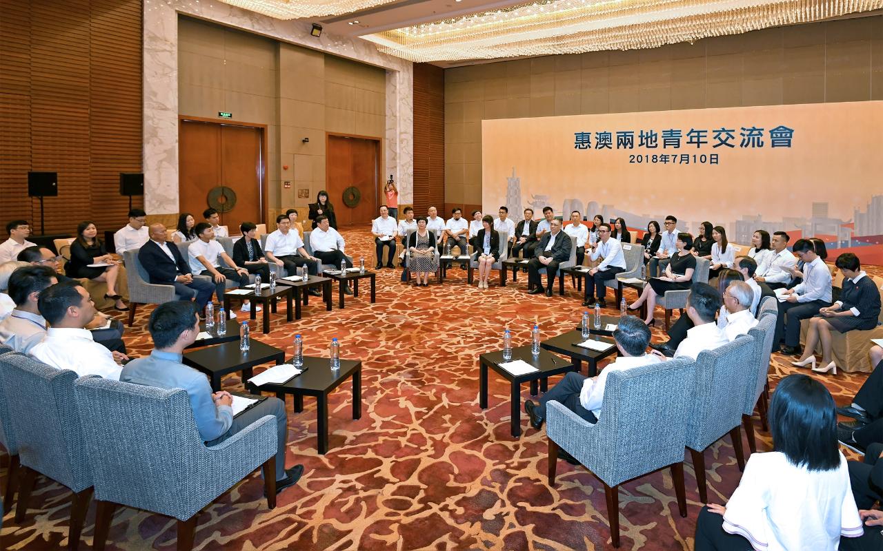 正在惠州市訪問的行政長官崔世安及特區政府代表團今(10)日下午出席“惠澳兩地青年交流會”,聽取“千人匯”匯員與惠州市青聯代表就粵港澳大灣區發展與青年機遇進行交流。崔世安勉勵年青人要開放思想,裝備自己,投身粵港澳大灣區建設。
