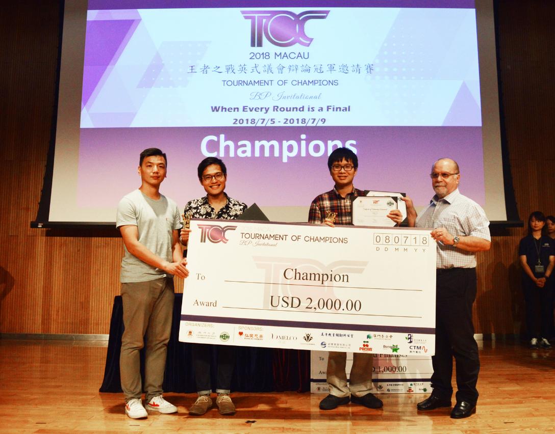 由澳門大學、澳門英語辯論協會聯合主辦的2018第一屆“王者之戰"英式議會辯論冠軍邀請賽的頒獎禮及閉幕式日前舉行。是次為澳門和亞洲首次邀請世界辯論比賽前八強及地區冠軍的賽事,今屆有北美、歐洲、亞洲、澳洲與新西蘭共88名頂級辯論辯手參與。