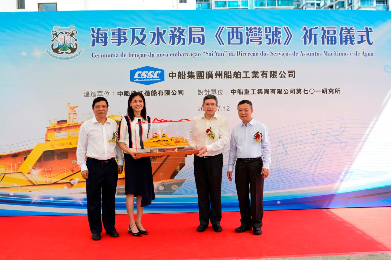 海事及水務局轄下的新救援船“西灣號”救援船祈福儀式於今(11)日下午3時在政府船塢進行,儀式由運輸工務司司長羅立文及海事局局長黃穗文主禮。局方早前已對“西灣號”救援船進行一系列船隻性能及航行的相關測試,正式投入運作後將負責澳門機場附近海面的戒備和搜救工作。