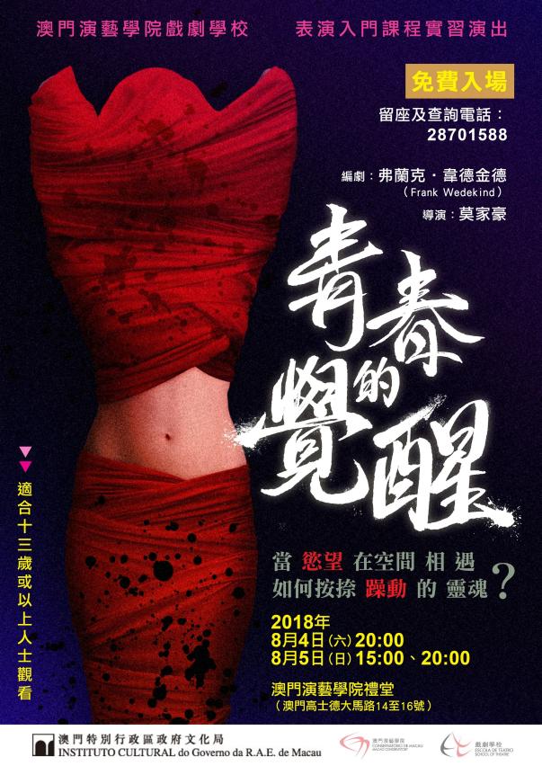 文化局澳門演藝學院戲劇學校將於八月四及五日(星期六及日)晚上八時及五日下午三時於澳門演藝學院禮堂連演三場《青春的覺醒》,由課程導師莫家豪擔任導演、表演入門課程學生演出。演出免費入場,歡迎有興趣市民留座觀賞。