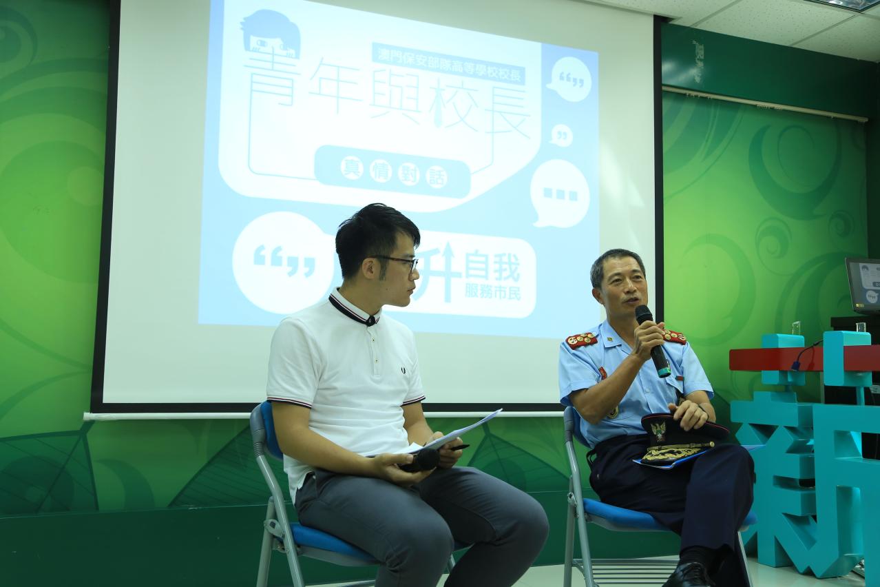 為促進與本澳大專院校學生的溝通交流,澳門保安部隊高等學校許少勇校長,於7月25日下午走訪澳門中華新青年協會,與本澳大專學生進行“青年與校長真情對話” 交流會,以“提升自我,服務市民”為題,分享其在培訓工作的經驗和體會,勉勵年青人堅守信念、逆境自強,鼓勵青年積極投身保安部隊,服務市民。