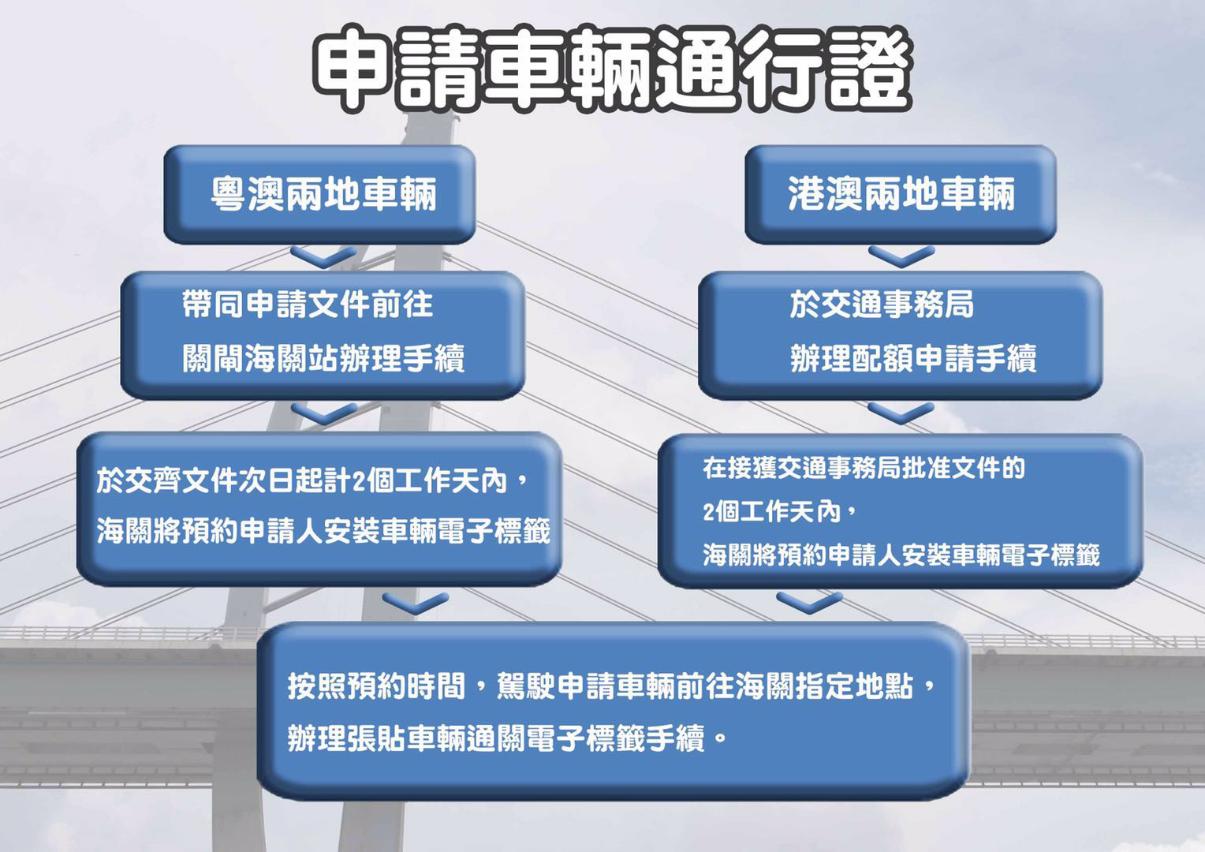 因應港珠澳大橋即將通車,澳門海關將為通行港澳之車輛增設辦理通行證的服務,首次申請或續期須提交之文件,以及辦理費用可參閱交通事務局網頁https://www.gov.mo/zh-hant/services/ps-2021/ps-2021a/。海關在接獲交通事務局批准文件的2個工作天內,將會致電通知車主,車主須在辦公時間內,駕駛申請車輛前往海關指定地點,辦理張貼車輛通關電子標籤手續。