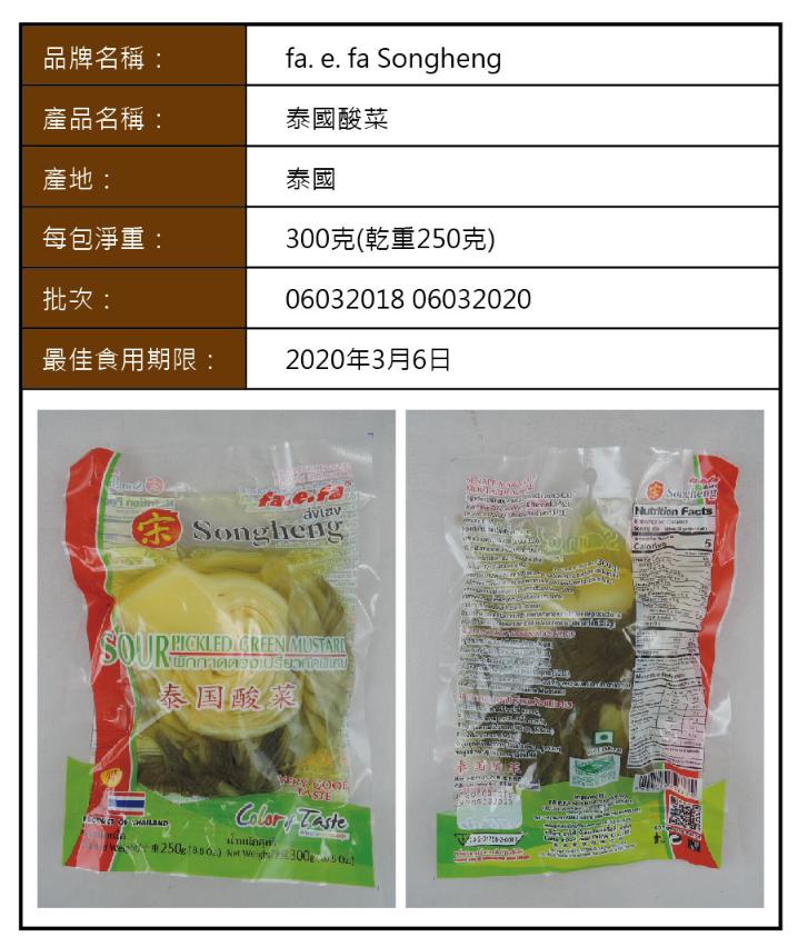 食安中心透過恆常食品市場抽樣監察,於各零售點抽取樣本進行檢測,發現一款預先包裝泰國酸菜,樣本含百萬分之六百五十的二氧化硫,含量未能通過檢測。該產品名稱為“泰國酸菜”,品牌為“fa. e. fa Songheng”,產地為泰國,每包淨重300克(乾重250克),批次為06032018 06032020,最佳食用期限為2020年3月6日。