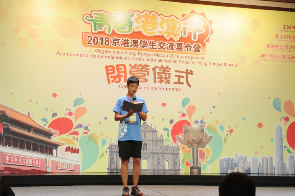 閉營儀式於7月30日在澳門旅遊塔會展娛樂中心舉行。出席閉營儀式的嘉賓包括教青局代局長梁慧琪、北京市教育委員會委員王定東、香港特別行政區政府教育局首席教育主任劉嘉倩、中聯辦教育與青年工作部處長級助理曲曉燕及澳門大學校長辦公室主任汪淇等。京港澳三地學生代表分別在閉營儀式上致辭,表示在這一次的旅程中,和其餘兩地的學生交流,分享彼此不同的生活經驗和學習態度,讓他們深深體驗了不一樣的生活,獲益良多。是次交流營給他們留下了深刻而難忘的印象,開闊了視野,加深了對三地文化的了解,更贏得了珍貴的友誼。三地學生還演出話劇、歌曲、太極扇及舞蹈等,各顯所長,盡展多姿多彩的文化特色。最後京港澳師生合作表演舞蹈,為活動劃上了圓滿的句號。