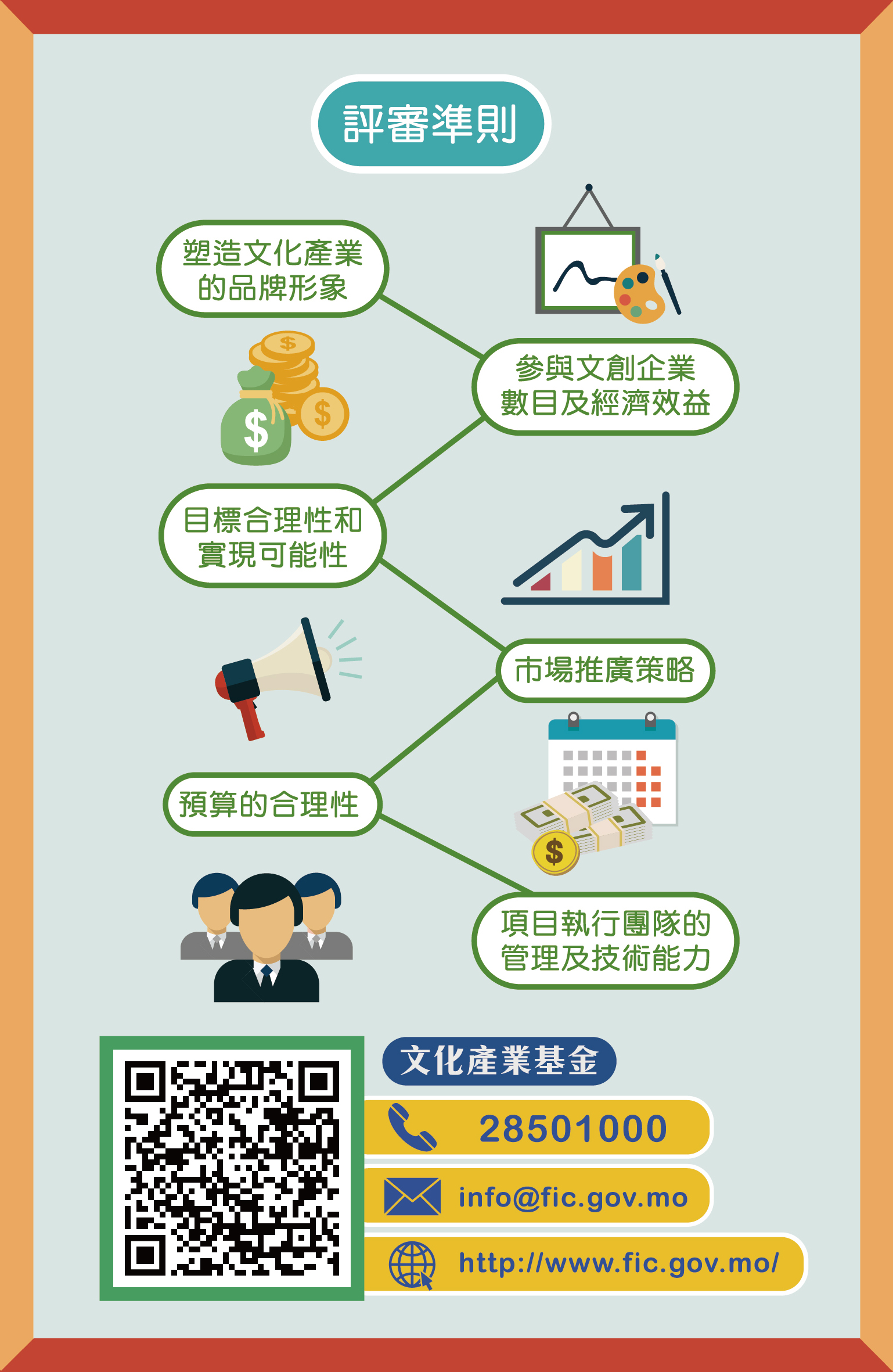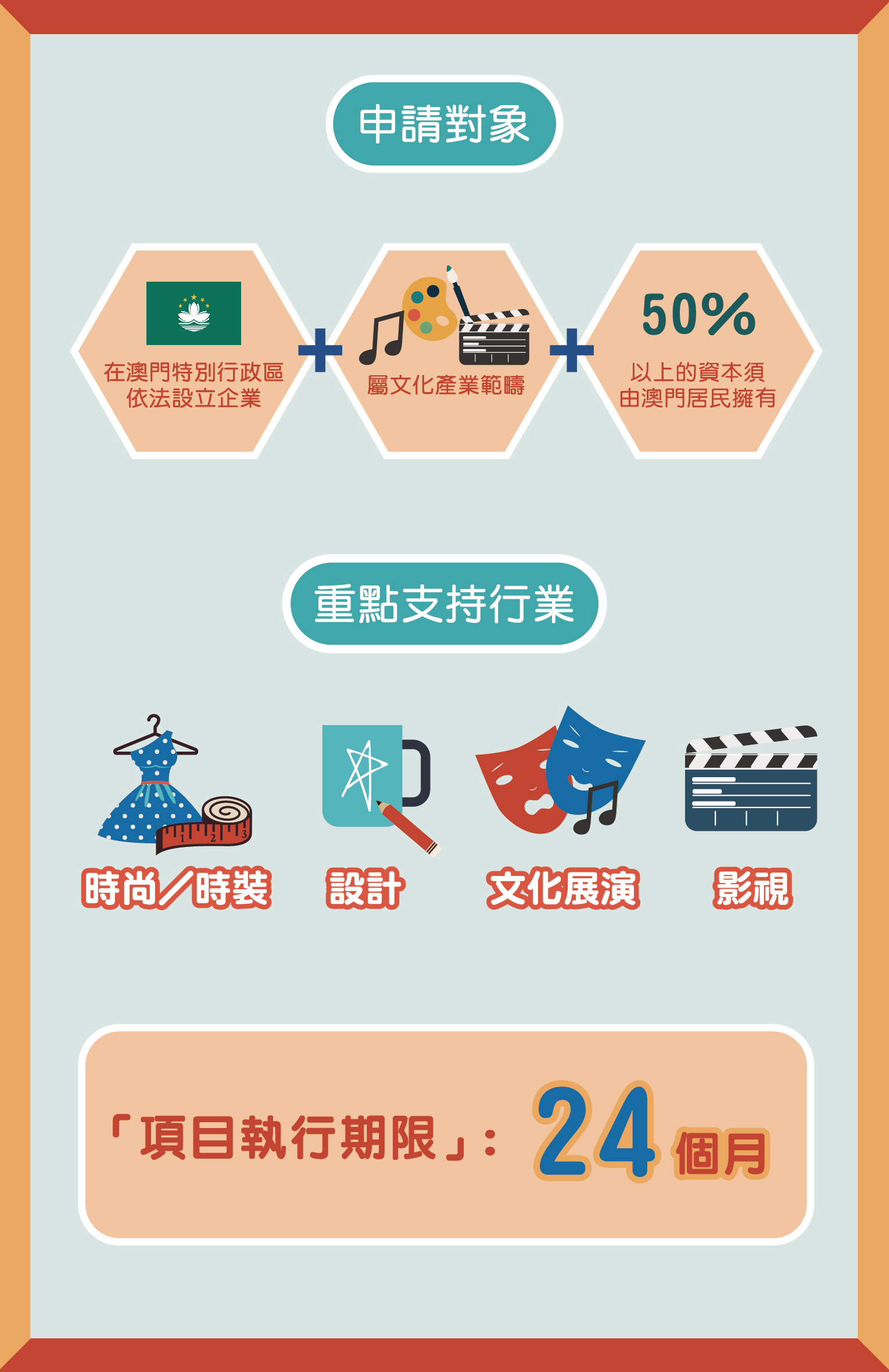 申請日期由本年8月1日至10月31日,申請者必須為在澳門特別行政區依法設立的文產企業,如商業企業主為自然人須是澳門居民,商業法人企業百分之五十以上的資本須由澳門特區居民持有。資助名額5個,經評審後擇優資助,資助額上限為澳門幣500萬元,項目完成期限為24個月。