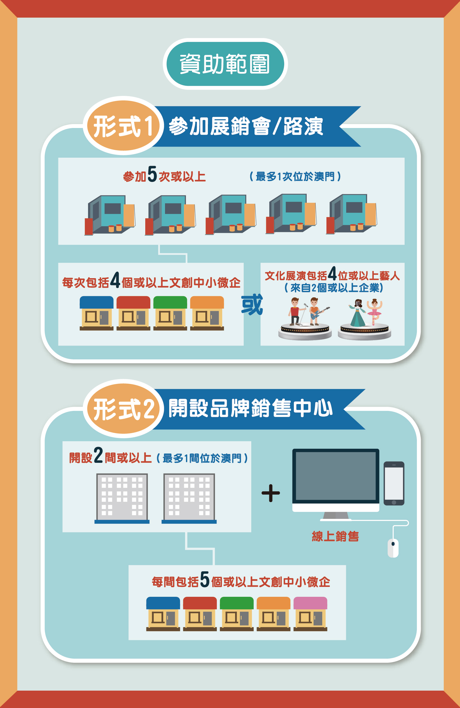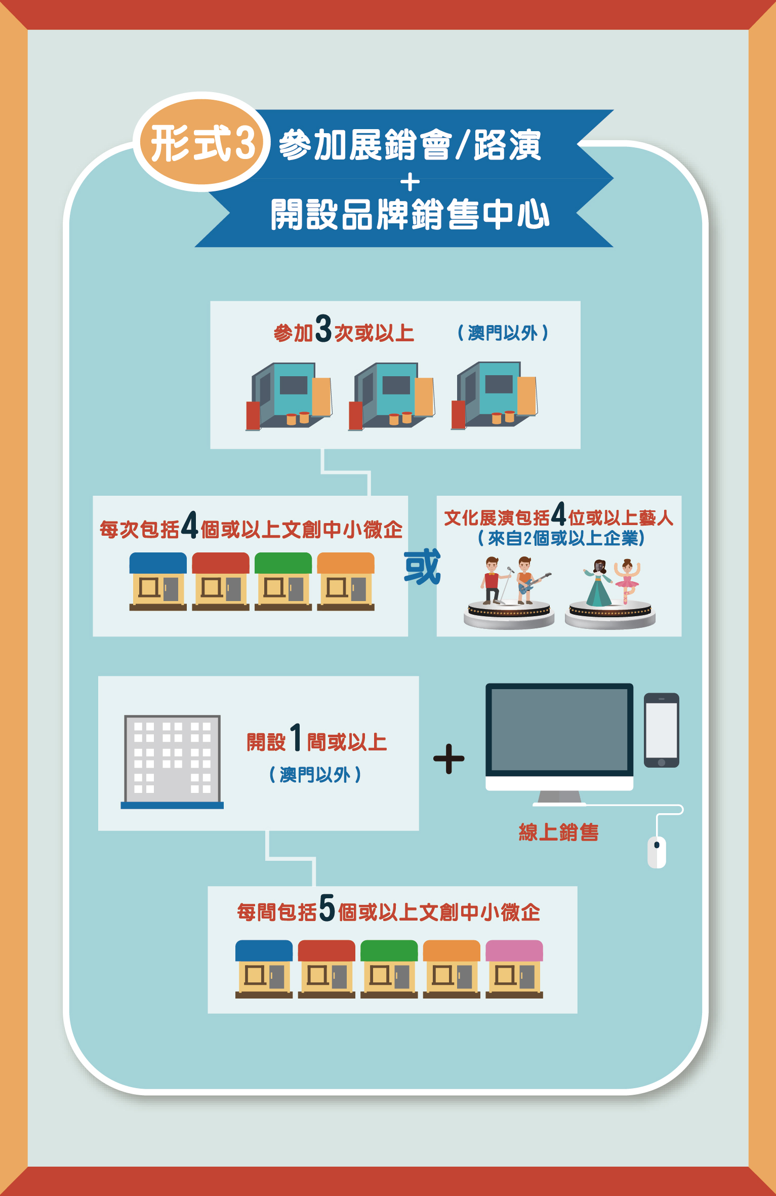 三是參加展銷會/路演及開設品牌銷售中心。申請者組織4個或以上文創中小微企參與3次或以上澳門以外目標市場的展銷會/路演(如路演屬文化展演範疇,則必須涵蓋兩個或以上的文創中小微企旗下4位或以上藝人);以及組織5個或以上文創中小微企開設1間或以上位於澳門以外目標市場的澳門文創產品銷售中心,且持續營運最少2年,並搭建相應的線上銷售。