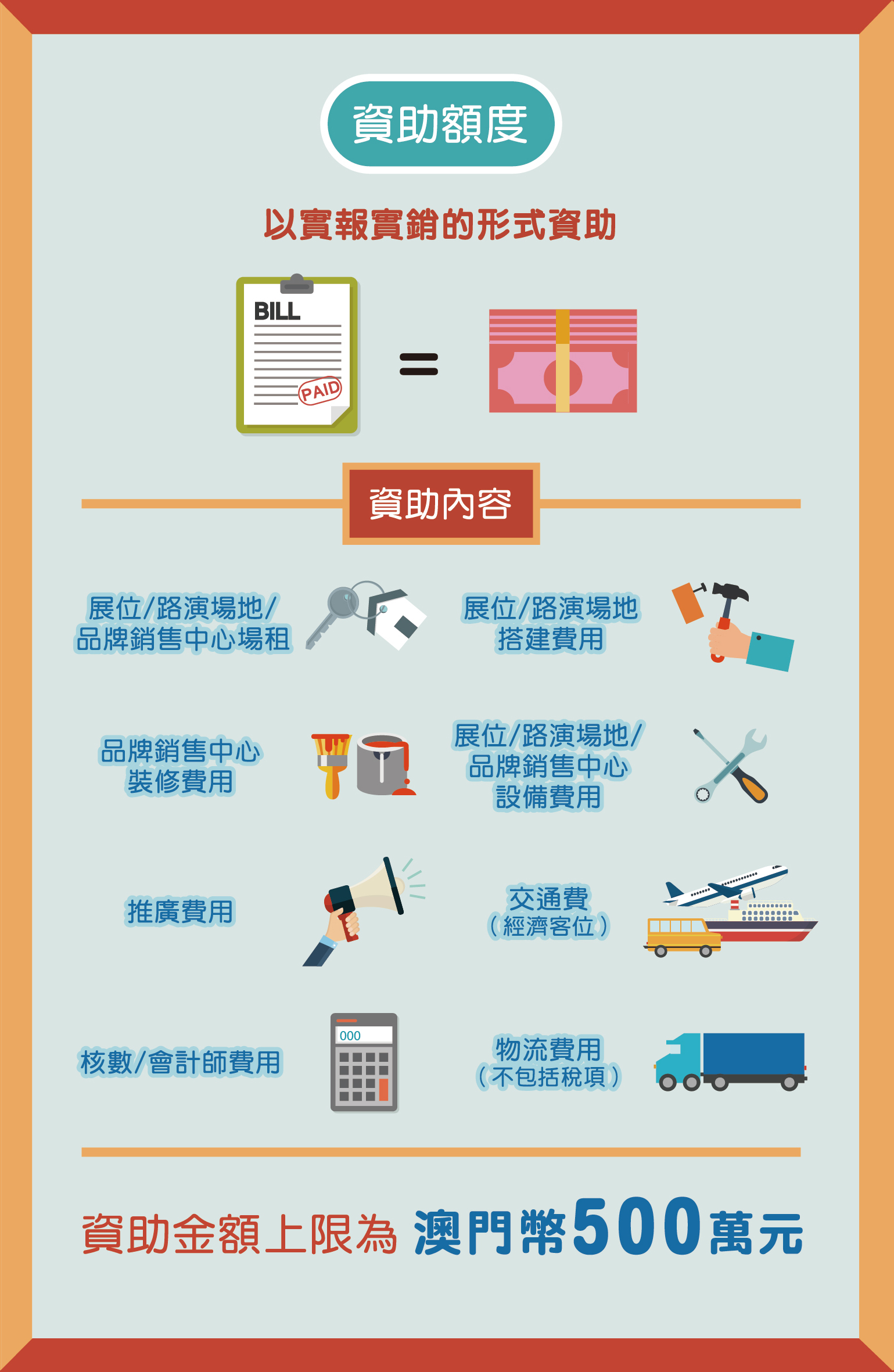 資助以實報實銷形式發出,資助內容包括展位/路演場地/品牌銷售中心場租;展位/路演場地搭建費用;品牌銷售中心裝修費用;推廣費用;展位/路演場地/品牌銷售中心設備費用;交通費(經濟客位);核數/會計師費用;物流費用(不包括稅項)等與項目直接相關的費用。