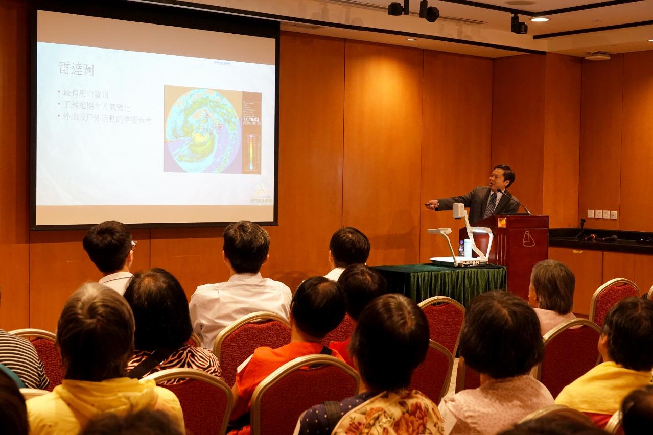 氣象防災講座由氣象局氣象技術員葉婷婷和氣象學會會長方志剛主持,主要向參與者講解第61/2018號行政命令中《熱帶氣旋信號》及第76/2018號行政命令中《風暴潮警告系統》、颱風和風暴潮的基礎知識、安全措施和天氣變化、澳港兩地發出風球的時間常有差異的原因、以及天氣預報工作的困難和限制等。