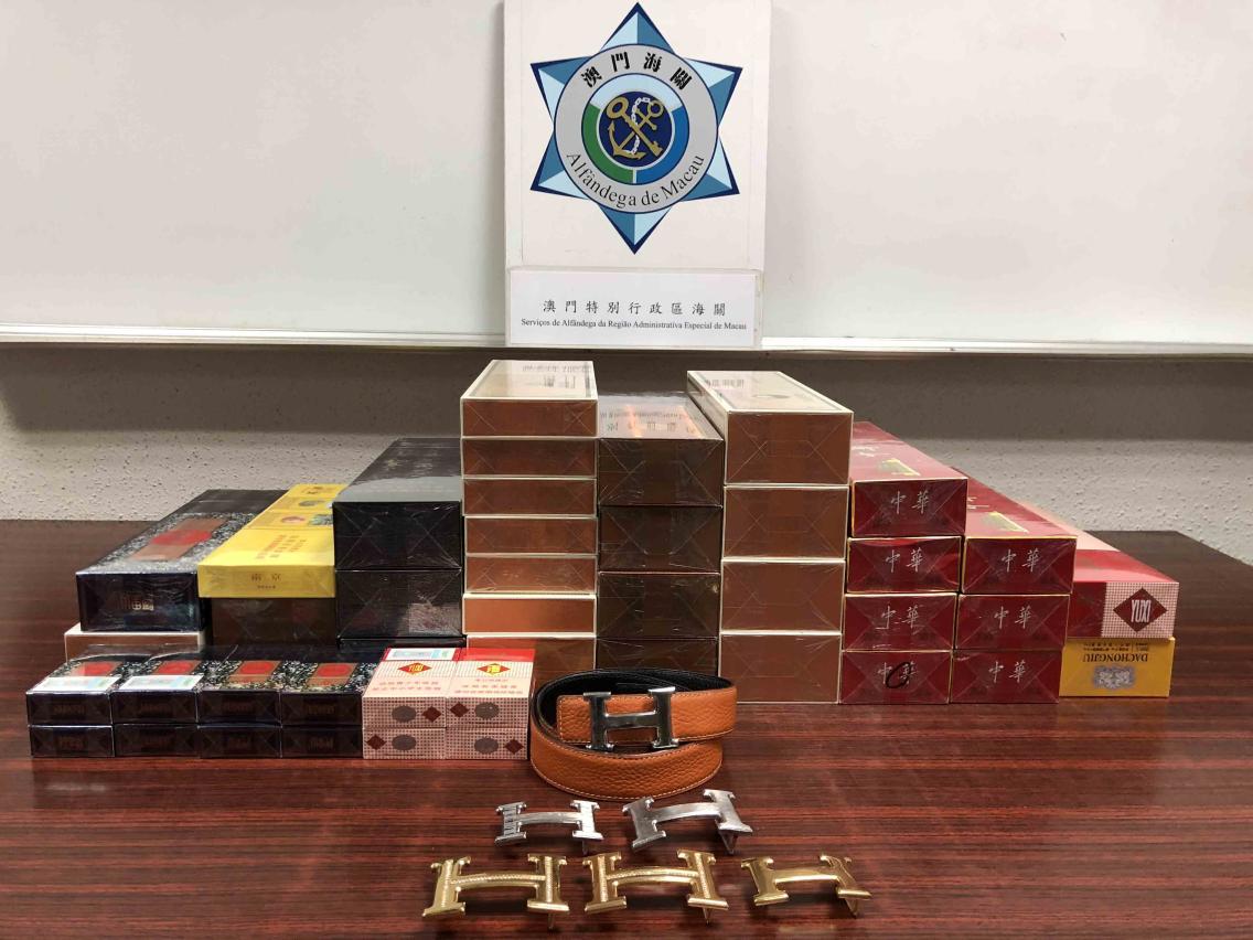 海關經過調查,於本月7日採取行動,先後搜查皇朝區兩間店舖,在其中一間店舖內緝獲六件懷疑假冒知名品牌物品,包括5個皮帶扣以及1個皮帶扣連皮帶,有關物品若以正價出售,約值澳門幣41萬。海關與衛生局控煙辦人員亦在店內查獲未完稅香煙3,680支,而在區內另一店舖亦搜出2,960支未完稅香煙。