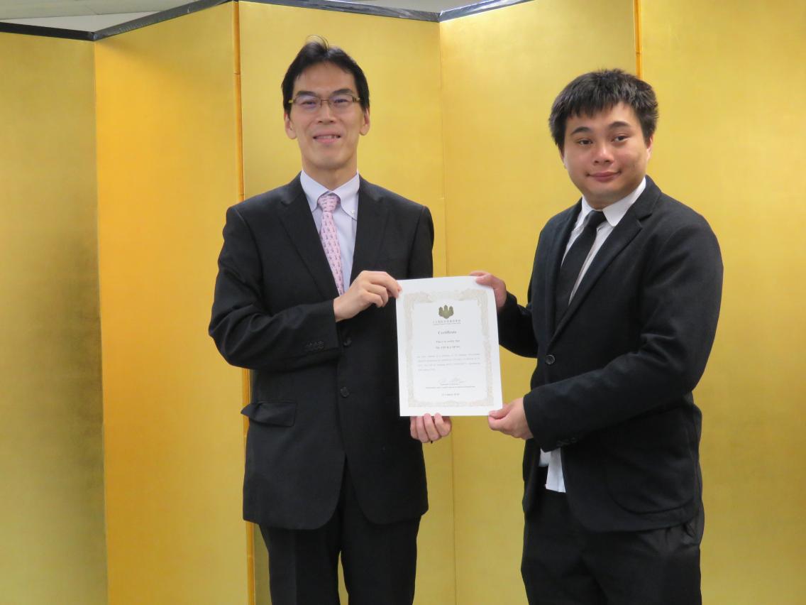 日本國駐香港總領事館日前舉行2018年度秋期國費留學生赴日前激勵會,日本國駐香港總領事館廣田首席代表於會上向6位日本語及日本文化研修留學生與研究留學生頒發獎學金證書,澳門區僅有葉家昇獲得。葉家昇表示十分珍惜這次留學機會,認為獲頒獎學金是對其過去努力的肯定,希望留學期間繼續研究日本文化,瞭解當地的傳統禮節。