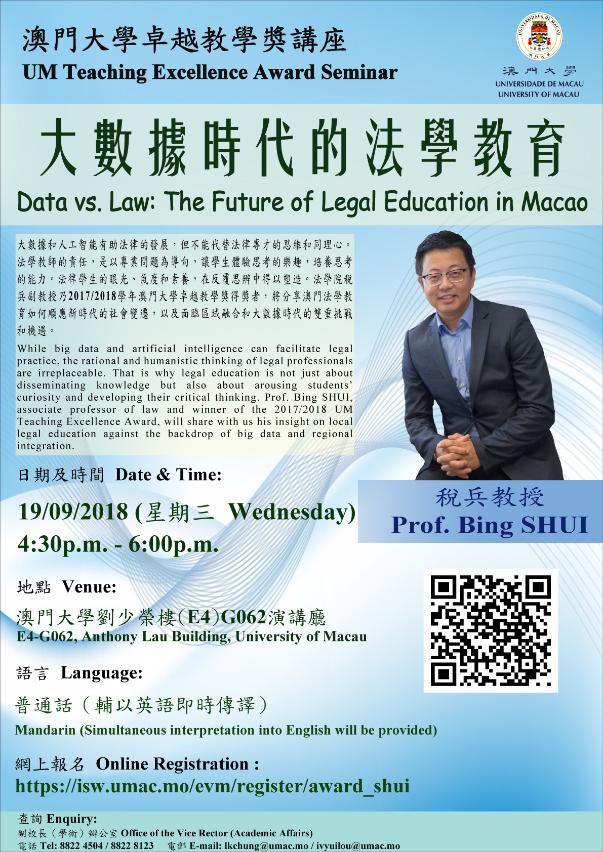 澳門大學將於9月19日(下週三)舉行“澳門大學卓越教學獎"講座,邀請了2017/2018學年得獎者、法學院副教授稅兵擔任主講,以“大數據時代的法學教育"為題,探討澳門法學教育如何順應新時代的社會變遷,以及面臨區域融合和大數據時代的雙重挑戰和機遇。歡迎有興趣人士參加。