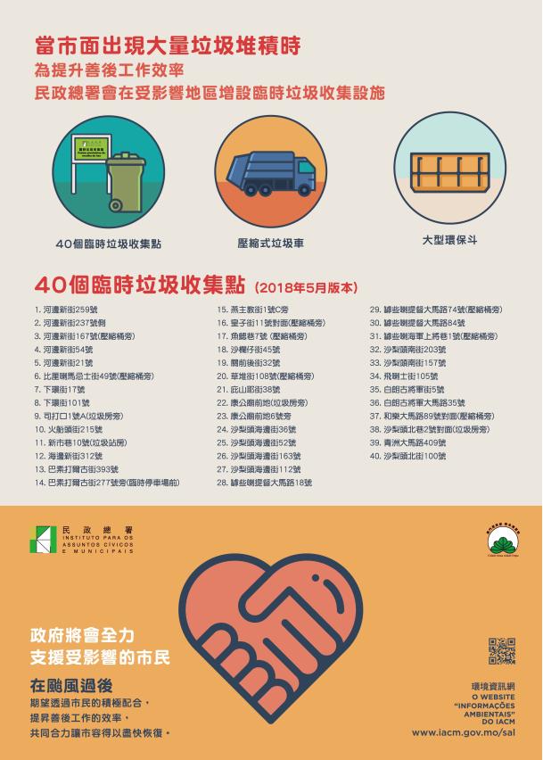 當八號風球除下後,清潔專營公司會盡快安排垃圾清運工作,民署亦會派員到全澳各區巡視市面情況,如發現公共街道有大量垃圾堆積時,會啟動臨時措施,包括在受影響的低窪地區增設四十個臨時垃圾收集點(詳見附表),在合適地點設置壓縮式垃圾車及大型環保斗,同時會在站點內設指示牌、手推車及垃圾袋等,加派人員支援站點工作,加快收集及清運垃圾工作,盡快恢復市面的環境衛生狀況。