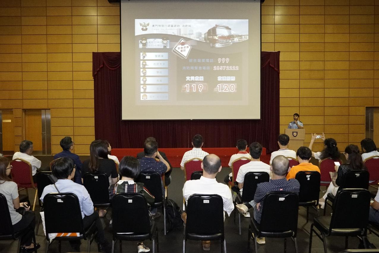 為此,於9月22日,消防局為澳門物業管理專業人員協會在消防局總部開辦防火及救護知識培訓課程,合共約34名物管業從業員參與,課程內容主要包括:介紹消防局的使命、信念及抱負、燃燒的理論、常見火警危機、正確及安全地使用燃氣爐具、物管業從業員的日常消防安全責任、發生火警時的應變措施及逃生技巧;另外,還介紹了大廈消防設施設備、日常消防系統之養護方法、如何正確使用大廈的滅火設備撲滅火警、基礎救護知識及灌輸切勿濫用救護車等訊息。冀通過課程令從業員學以致用,提高專業管理水平。