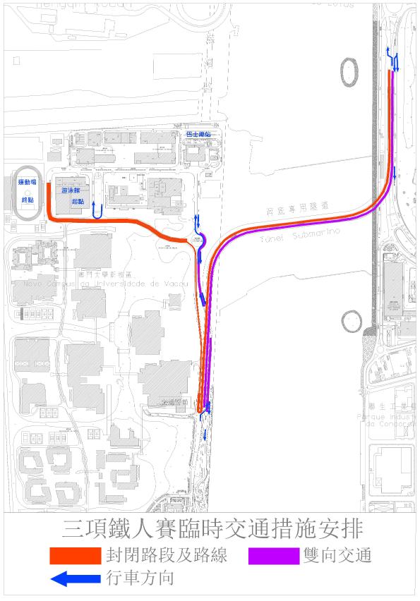 配合體育局舉行三項鐵人賽,9月30日(周日)上午6時至11時,澳門大學校園多處道路實施一系列臨時交通安排,“澳大/綜合體育館”、“澳大/大學展館”、“澳大/中央教學樓”巴士站當日(30日)上午7時30分至11時暫停使用,71、72、73巴士路線改道行駛,交通事務局呼籲公眾留意。
