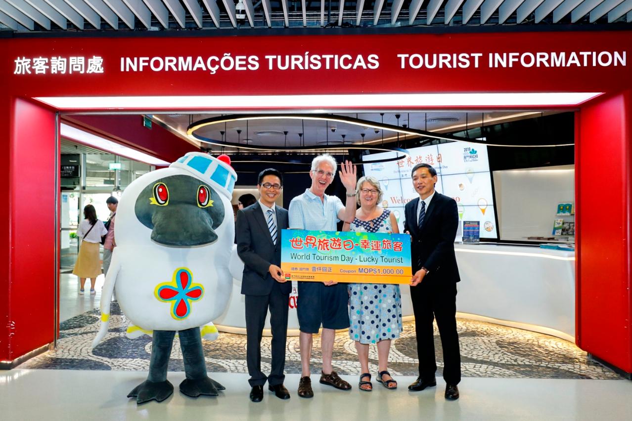旅遊局副局長程衛東及許耀明等領導及主管於早上到外港客運碼頭,向“世界旅遊日”的幸運旅客送上紀念品;澳門旅遊吉祥物 “麥麥”亦到場歡迎旅客。來自英國的旅客David Clark與太太Janet Stopher Clark二人以自由行形式體驗 “一程多站”遊,對自己今天成為幸運旅客感到十分驚喜。曾到葡國旅遊的David今次計劃來澳參觀古舊的建築以及品嚐澳門的葡萄牙美食和葡撻等,晚上將會欣賞著名的大型歌舞表演。旅遊局屬下的旅客詢問處全天備有紀念品送贈給旅客。