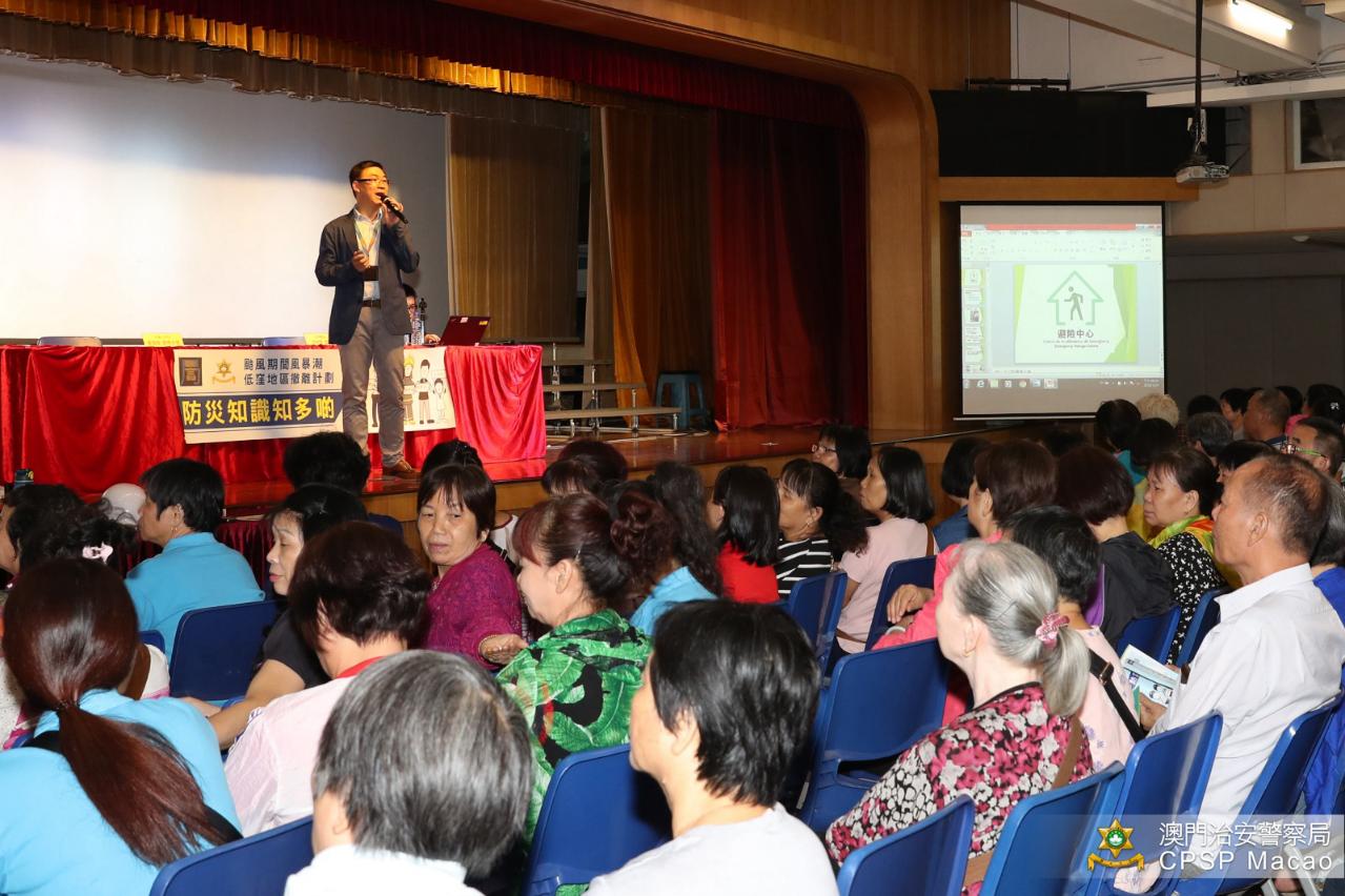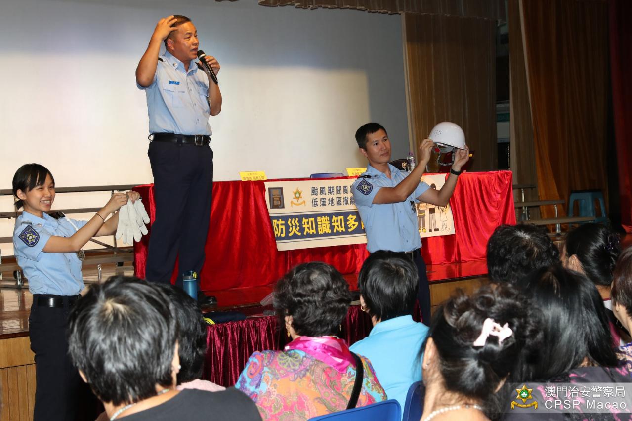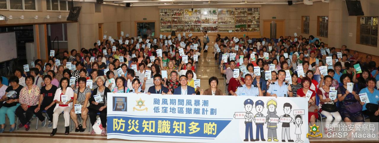 為加強市民認識風暴潮撤離計劃,提升市民防災避險意識,治安警察局在警察總局統籌下,持續宣傳“颱風期間風暴潮低窪地區疏散撤離計劃”及相關民防資訊。10月6日晚,治安警察局聯同社會工作局,在澳門坊眾學校舉辦講座,約350位市民參與。是次講座為了讓更廣泛的群眾參與,活動以公開報名的形式進行,並得到澳門街坊總會北區辦事處全力支持。澳門街坊總會北區辦事處周宜心主任表示,感謝警方透過不同渠道傳播民防資訊予社會大眾,以提升社會應對危機和災害的意識。