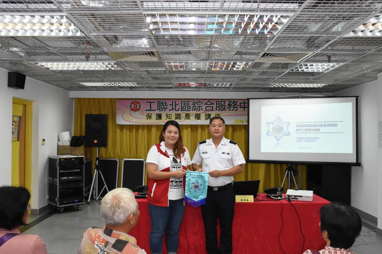 講座由海關知識產權廳監檢處處長余益銓、監檢處行動主任鄭華錦主講,澳門工會聯合總會北區綜合服務中心主任趙蘭瑛以及一眾會員出席。
